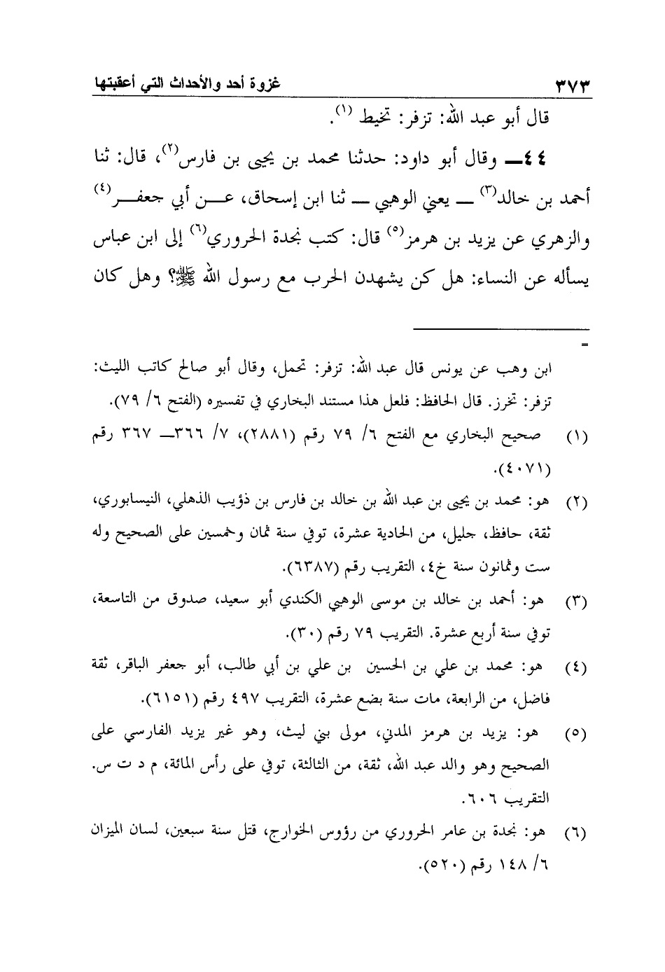 44- وقال أبو داود: حدثنا محمد بن يحيى بن فارس2، قال: ثنا أحمد بن خالد3 - يعني الوهبي - ثنا ابن إسحاق، عن أبي جعفر4 والزهري عن يزيد بن هرمز5 قال: كتب نجدة الحروري6 إلى ابن عباس يسأله عن النساء: هل كن يشهدن الحرب مع رسول الله صلى الله عليه وسلم؟ وهل كان