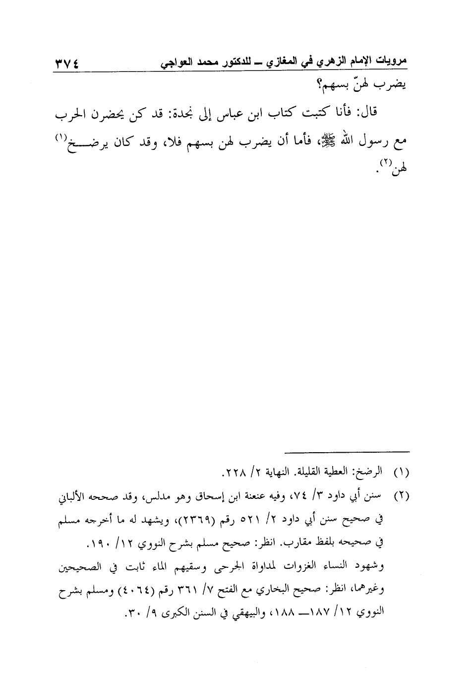 قال: فأنا كتبت كتاب ابن عباس إلى نجدة: قد كن يحضرن الحرب مع رسول الله صلى الله عليه وسلم، فأما أن يضرب لهن بسهم فلا، وقد كان يرضخ1 لهن2.