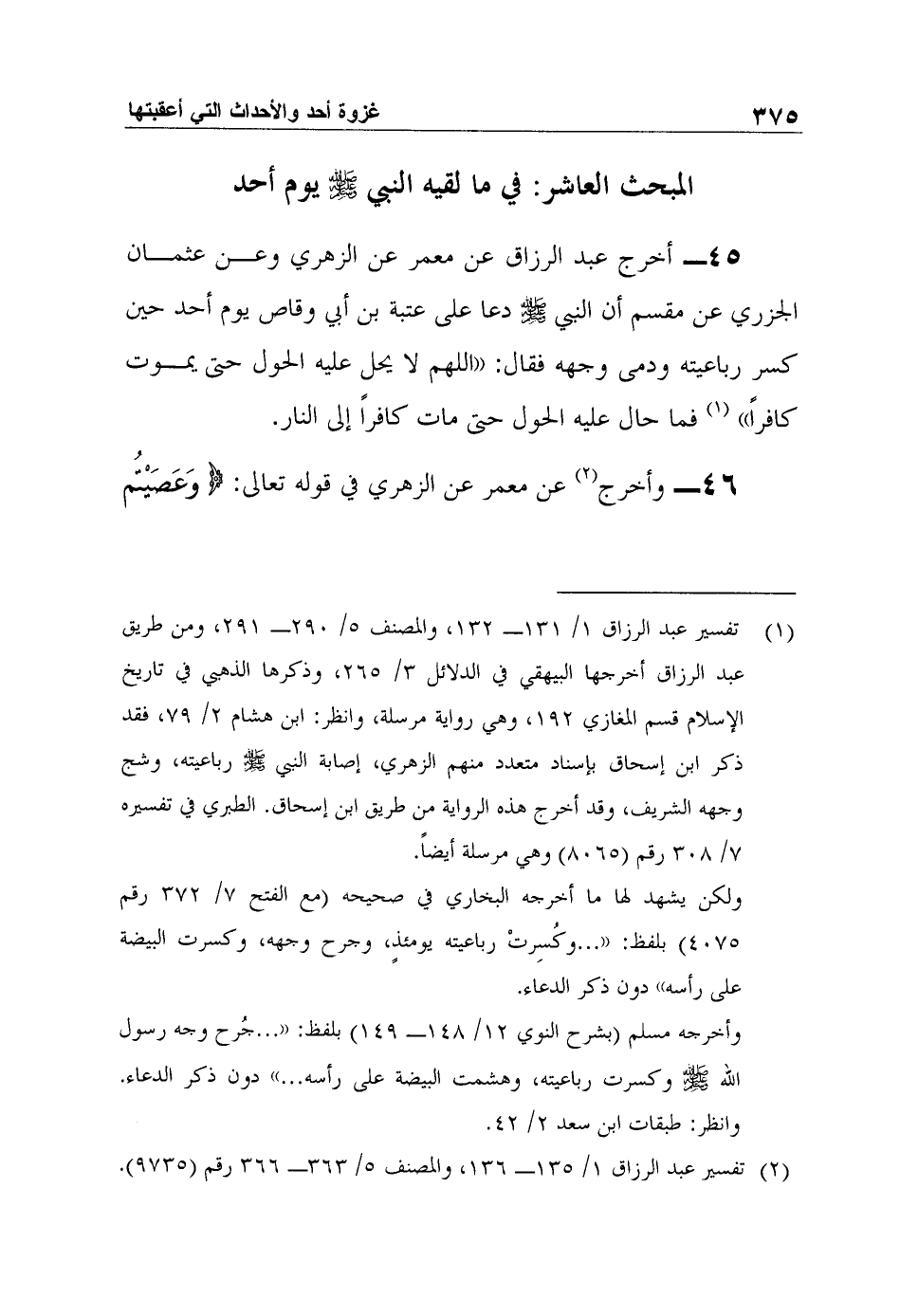 45- أخرج عبد الرزاق عن معمر عن الزهري وعن عثمان الجزري عن مقسم أن النبي صلى الله عليه وسلم دعا على عتبة بن أبي وقاص يوم أحد حين كسر رباعيته ودمى وجهه فقال: "اللهم لا يحل عليه الحول حتى يموت كافراً" 1 فما حال عليه الحول حتى مات كافراً إلى النار.