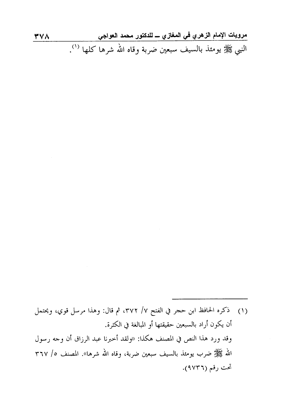 وقد ورد هذا النص في المصنف هكذا: (ولقد أخبرنا عبد الرزاق أن وجه رسول الله صلى الله عليه وسلم ضرب يومئذ بالسيف سبعين ضربة، وقاه الله شرها) . المصنف 5/ 367 تحت رقم (9736) .