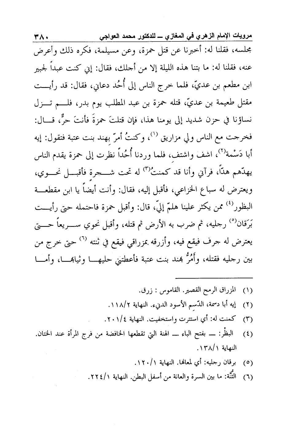 مجلسه، فقلنا له: أخبرنا عن قتل حمزة، وعن مسيلمة، فكره ذلك وأعرض عنه، فقلنا له: ما بتنا هذه الليلة إلا من أجلك، فقال: إني كنت عبداً لجبير ابن مطعم بن عديّ، فلما خرج الناس إلى أُحُد دعاني، فقال: قد رأيت مقتل طعيمة بن عديّ، قتله حمزة بن عبد المطلب يوم بدر، فلم تزل نساؤنا في حزن شديد إلى يومنا هذا، فإن قتلتَ حمزةَ فأنتَ حرٌّ، قال: فخرجت مع الناس ولي مزاريق1، وكنتُ أمرّ بِهند بنت عتبة فتقول: إيه أبا دَسْمة2، اشف واشتفِ، فلما وردنا أُحُداً نظرت إلى حمزة يقدم الناس يهدّهم هدّاً، فرآني وأنا قد كمنتُ3 له تحت شجرةٍ فأقبل نحوي، ويعترض له سباع الخزاعي، فأقبل إليه، فقال: وأنت أيضاً يا ابن مقطعة البظور4 ممن يكثر علينا هلمّ إليّ، قال: وأقبل حمزة فاحتمله حتى رأيت بَرَقان5 رجليه، ثم ضرب به الأرض ثم قتله، وأقبل نحوي سريعاً حتى يعترض له جرف فيقع فيه، وأزرقه بمزراقي فيقع في ثنته6 حتى خرج من بين رجليه فقتله، وأَمُرُّ بهند بنت عتبة فأعطتني حليها وثيابها، وأما