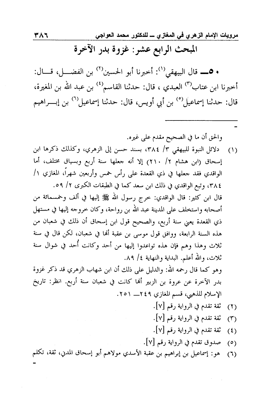 وهو كما قال رحمه الله: والدليل على ذلك أن ابن شهاب الزهري قد ذكر غزوة بدر الآخرة عن عروة بن الزبير أنها كانت في شعبان سنة أربع. انظر: تاريخ الإسلام للذهبي، قسم المغازي 249 - 251.