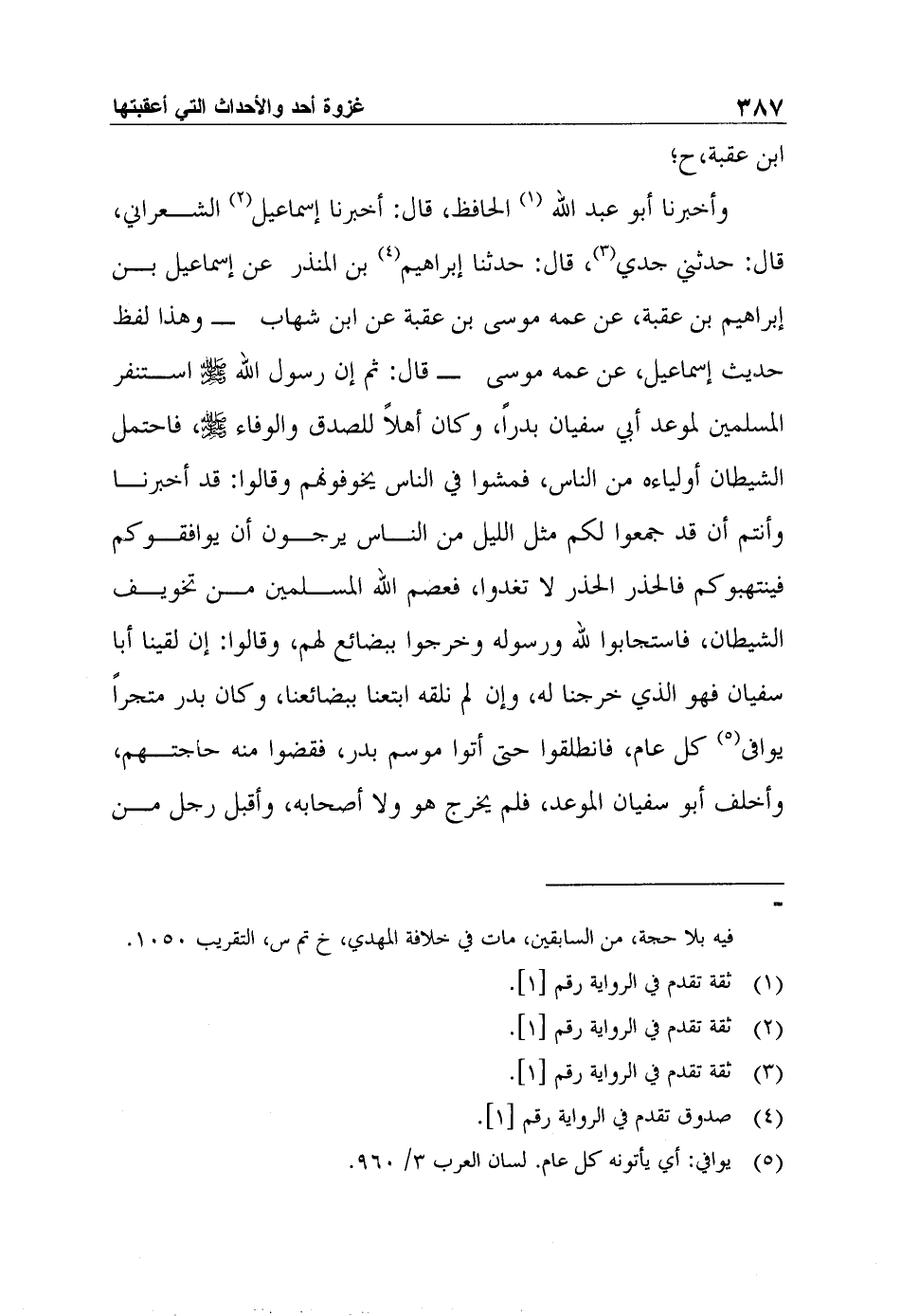 ابن عقبة (ح) وأخبرنا أبو عبد الله1 الحافظ، قال: أخبرنا إسماعيل2 الشعراني، قال: حدثني جدي3، قال: حدثنا إبراهيم4 بن المنذر عن إسماعيل بن إبراهيم بن عقبة، عن عمه موسى بن عقبة عن ابن شهاب - وهذا لفظ حديث إسماعيل، عن عمه موسى - قال: ثم إن رسول الله صلى الله عليه وسلم استنفر المسلمين لموعد أبي سفيان بدراً، وكان أهلاً للصدق والوفاء صلى الله عليه وسلم، فاحتمل الشيطان أولياءه من الناس، فمشوا في الناس يخوفونهم وقالوا: قد أخبرنا وأنتم أن قد جمعوا لكم مثل الليل من الناس يرجون أن يوافقوكم فينتهبوكم فالحذر الحذر لا تغدوا، فعصم الله المسلمين من تخويف الشيطان، فاستجابوا لله ورسوله وخرجوا ببضائع لهم، وقالوا: إن لقينا أبا سفيان فهو الذي خرجنا له، وإن لم نلقه ابتعنا ببضائعنا، وكان بدر متجراً يوافى5 كل عام، فانطلقوا حتى أتوا موسم بدر، فقضوا منه حاجتهم، وأخلف أبو سفيان الموعد، فلم يخرج هو ولا أصحابه، وأقبل رجل من