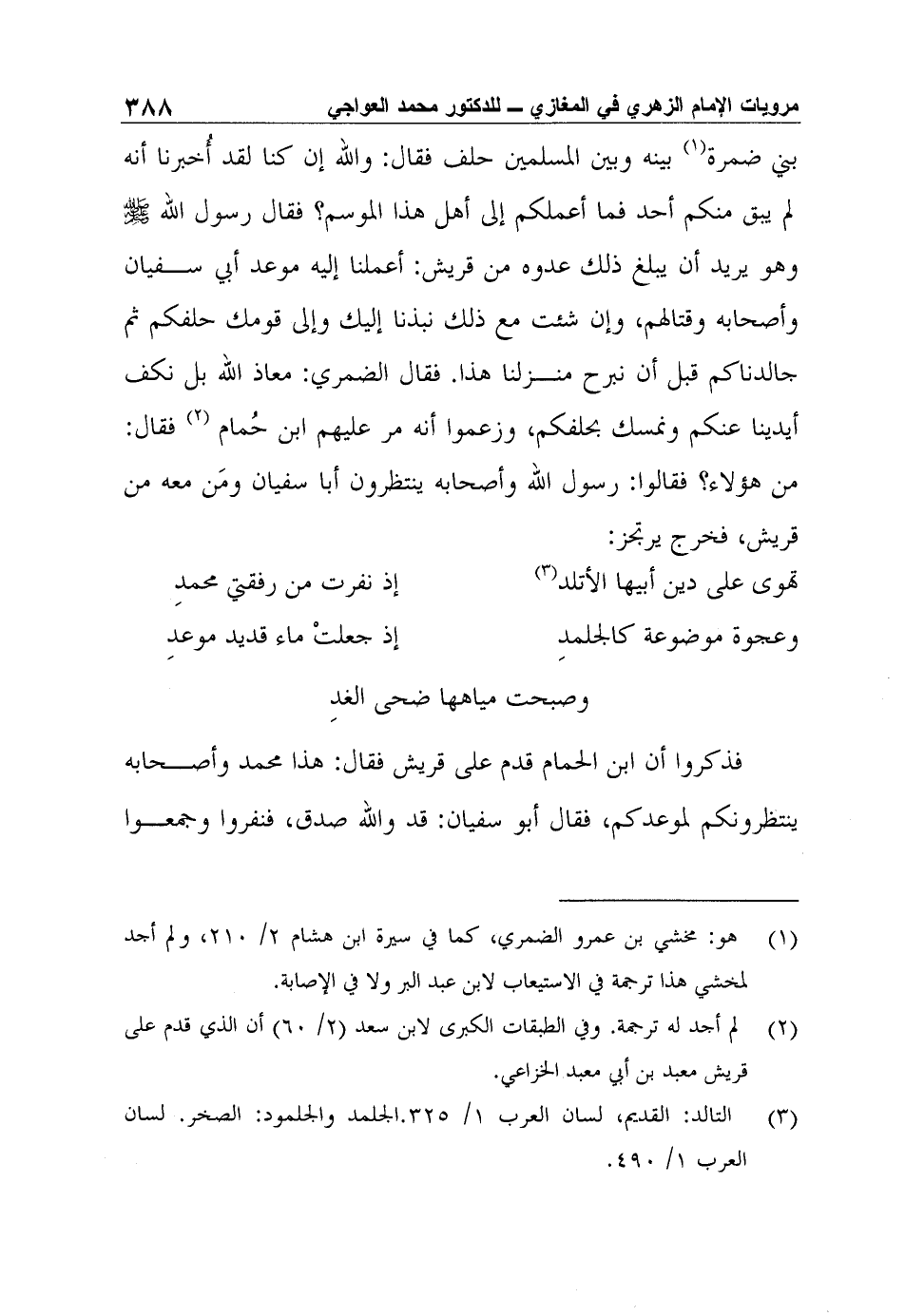 بني ضمرة1 بينه وبين المسلمين حلف فقال: والله إن كنا لقد أُخبرنا أنه لم يبق منكم أحد فما أعملكم إلى أهل هذا الموسم؟ فقال رسول الله صلى الله عليه وسلم وهو يريد أن يبلغ ذلك عدوه من قريش: أعملنا إليه موعد أبي سفيان وأصحابه وقتالهم، وإن شئت مع ذلك نبذنا إليك وإلى قومك حلفكم ثم جالدناكم قبل أن نبرح منزلنا هذا. فقال الضمري: معاذ الله بل نكف أيدينا عنكم ونمسك بحلفكم، وزعموا أنه مر عليهم ابن حُمام2 فقال: من هؤلاء؟ فقالوا: رسول الله وأصحابه ينتظرون أبا سفيان ومَن معه من قريش، فخرج يرتجز: