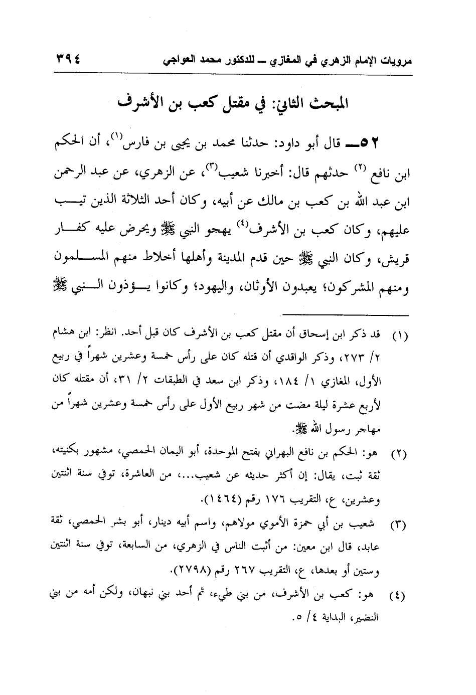 52- قال أبو داود: حدثنا محمد بن يحيى بن فارس1، أن الحكم ابن نافع2 حدثهم قال: أخبرنا شعيب3، عن الزهري، عن عبد الرحمن ابن عبد الله بن كعب بن مالك عن أبيه، وكان أحد الثلاثة الذين تيب عليهم، وكان كعب بن الأشرف4 يهجو النبي صلى الله عليه وسلم ويحرض عليه كفار قريش، وكان النبي صلى الله عليه وسلم حين قدم المدينة وأهلها أخلاط منهم المسلمون ومنهم المشركون؛ يعبدون الأوثان، واليهود؛ وكانوا يؤذون النبي صلى الله عليه وسلم