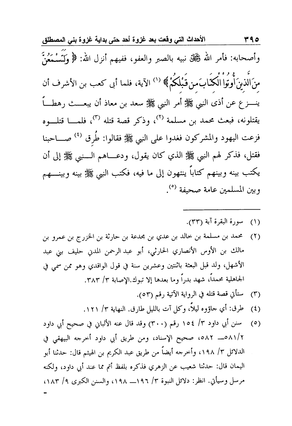 وأصحابه: فأمر الله عزوجل نبيه بالصبر والعفو، ففيهم أنزل الله: {وَلَتَسْمَعُنَّ مِنَ الَّذِينَ أُوتُواْ الْكِتَابَ مِن قَبْلِكُمْ} 1 الآية، فلما أبى كعب بن الأشرف أن ينزع عن أذى النبي صلى الله عليه وسلم أمر النبي صلى الله عليه وسلم سعد بن معاذ أن يبعث رهطاً يقتلونه، فبعث محمد بن مسلمة 2، وذكر قصة قتله3، فلما قتلوه فزعت اليهود والمشركون فغدوا على النبي صلى الله عليه وسلم فقالوا: طُرِق4 صاحبنا فقتل، فذكر لهم النبي صلى الله عليه وسلم الذي كان يقول، ودعاهم النبي صلى الله عليه وسلم إلى أن يكتب بينه وبينهم كتاباً ينتهون إلى ما فيه، فكتب النبي صلى الله عليه وسلم بينه وبينهم وبين المسلمين عامة صحيفة5.