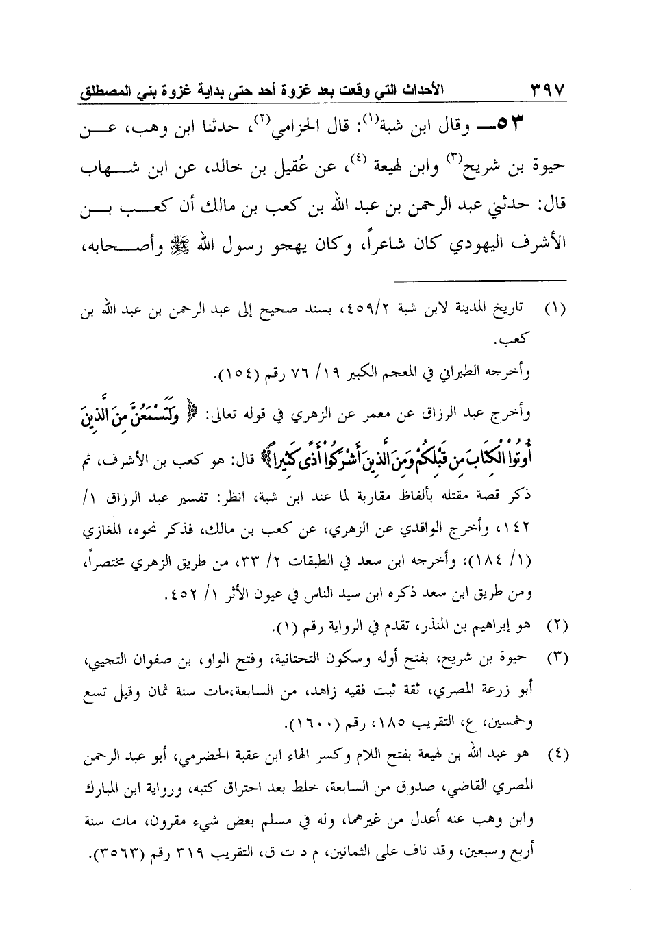 وأخرج عبد الرزاق عن معمر عن الزهري في قوله تعالى: {وَلَتَسْمَعُنَّ مِنَ الَّذِينَ أُوتُواْ الْكِتَابَ مِن قَبْلِكُمْ وَمِنَ الَّذِينَ أَشْرَكُواْ أَذًى كَثِيراً} قال: هو كعب بن الأشرف، ثم ذكر قصة مقتله بألفاظ مقاربة لما عند ابن شبة، انظر: تفسير عبد الرزاق 1/ 142، وأخرج الواقدي عن الزهري، عن كعب بن مالك، فذكر نحوه، المغازي (1/ 184) ، وأخرجه ابن سعد في الطبقات 2/ 33، من طريق الزهري مختصراً، ومن طريق ابن سعد ذكره ابن سيد الناس في عيون الأثر 1/ 452.