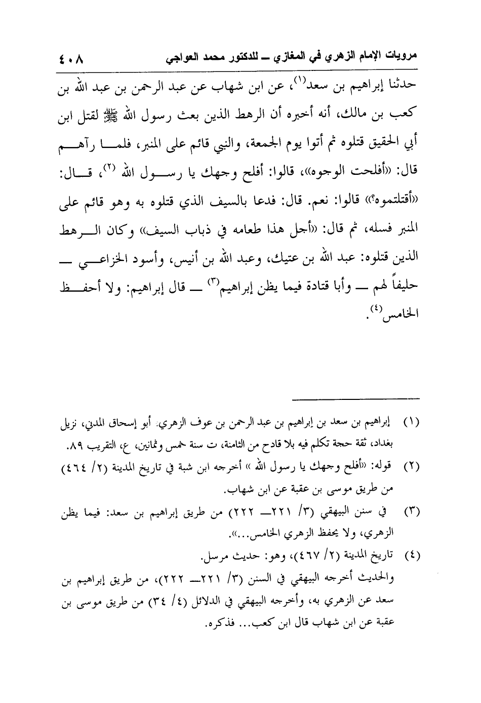حدثنا إبراهيم بن سعد1، عن ابن شهاب عن عبد الرحمن بن عبد الله بن كعب بن مالك، أنه أخبره أن الرهط الذين بعث رسول الله صلى الله عليه وسلم لقتل ابن أبي الحقيق قتلوه ثم أتوا يوم الجمعة، والنبي قائم على المنبر، فلما رآهم قال: (أفلحت الوجوه) ، قالوا: أفلح وجهك يا رسول الله2، قال: "أقتلتموه؟ " قالوا: نعم. قال: فدعا بالسيف الذي قتلوه به وهو قائم على المنبر فسله، ثم قال: “أجل هذا طعامه في ذباب السيف” وكان الرهط الذين قتلوه: عبد الله بن عتيك، وعبد الله بن أنيس، وأسود الخزاعي - حليفاً لهم - وأبا قتادة فيما يظن إبراهيم3 - قال إبراهيم: ولا أحفظ الخامس4.