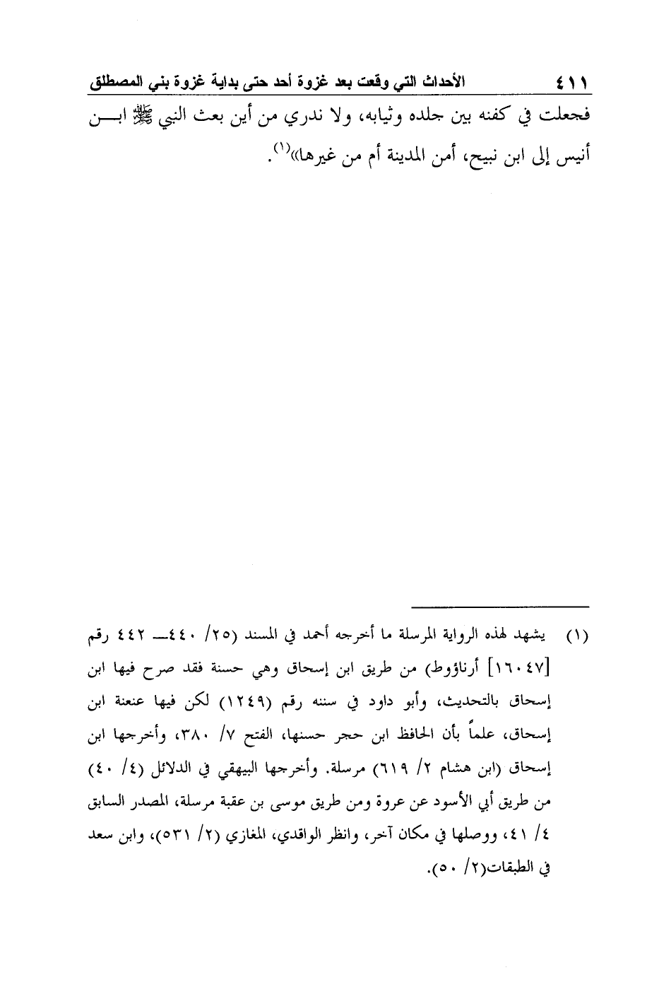 1 يشهد لهذه الرواية المرسلة ما أخرجه أحمد في المسند (25/ 440- 442 رقم [16047] أرناؤوط) من طريق ابن إسحاق وهي حسنة فقد صرح فيها ابن إسحاق بالتحديث، وأبو داود في سننه رقم (1249) لكن فيها عنعنة ابن إسحاق، علماً بأن الحافظ ابن حجر حسنها، الفتح 7/ 380، وأخرجها ابن إسحاق (ابن هشام 2/ 619) مرسلة. وأخرجها البيهقي في الدلائل (4/ 40) من طريق أبي الأسود عن عروة ومن طريق موسى بن عقبة مرسلة، المصدر السابق 4/ 41، ووصلها في مكان آخر، وانظر الواقدي، المغازي (2/ 531) ، وابن سعد في الطبقات (2/ 50) .