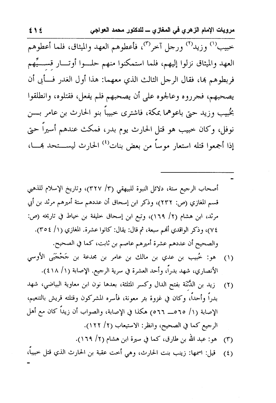 2 زيد بن الدَّثِنَة بفتح الدال وكسر المثلثة، بعدها نون ابن معاوية البياضي، شهد بدراً وأحداً، وكان في غزوة بئر معونة، فأسره المشركون وقتلته قريش بالتنعيم، الإصابة (1/ 565- 566) هكذا في الإصابة، والصواب أن زيداً كان مع أهل الرجيع كما في الصحيح، وانظر: الاستيعاب (2/ 122) .