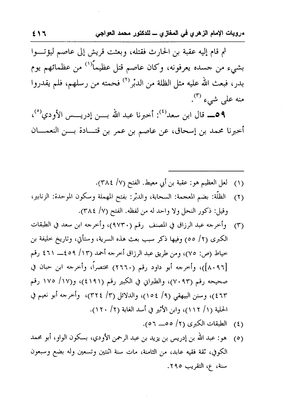 59- قال ابن سعد4: أخبرنا عبد الله بن إدريس الأودي5، أخبرنا محمد بن إسحاق، عن عاصم بن عمر بن قتادة بن النعمان