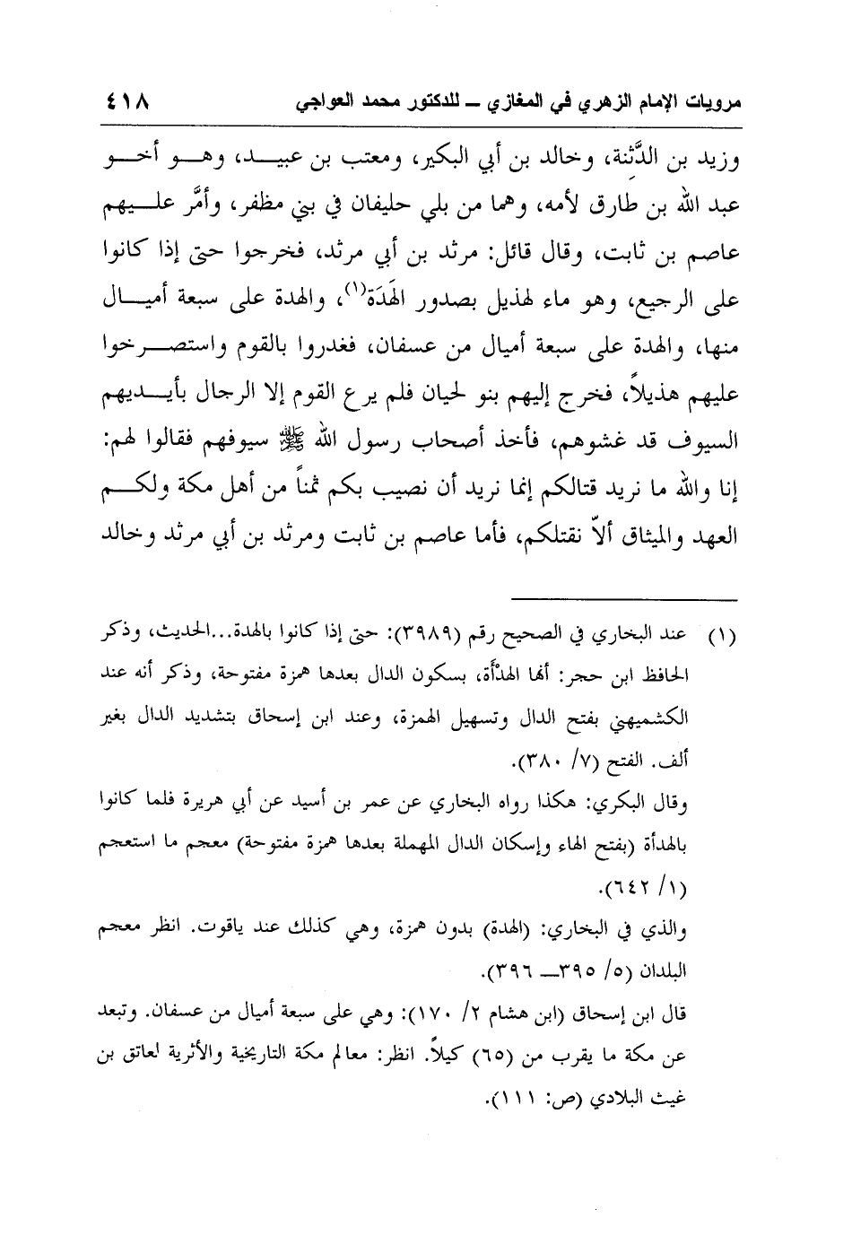 1 عند البخاري في الصحيح رقم (3989) : حتى إذا كانوا بالهدة ... الحديث، وذكر الحافظ ابن حجر: أنها الهدْأَة، بسكون الدال بعدها همزة مفتوحة، وذكر أنه عند الكشميهني بفتح الدال وتسهيل الهمزة، وعند ابن إسحاق بتشديد الدال بغير ألف. الفتح (7/ 380) .
