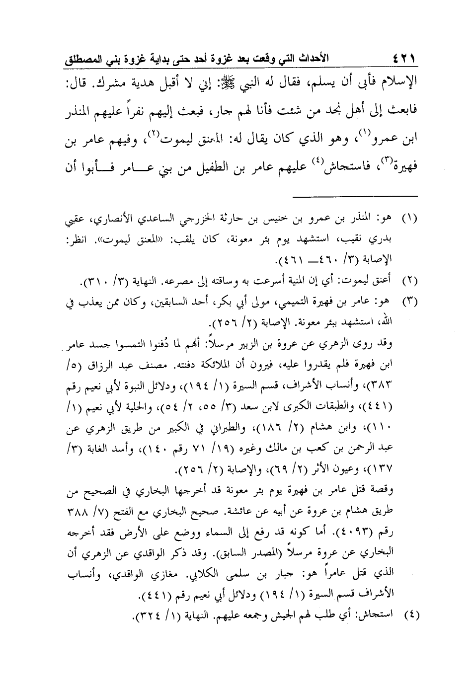 الإسلام فأبى أن يسلم، فقال له النبي صلى الله عليه وسلم: إني لا أقبل هدية مشرك. قال: فابعث إلى أهل نجد من شئت فأنا لهم جار، فبعث إليهم نفراً عليهم المنذر ابن عمرو1، وهو الذي كان يقال له: المعنق ليموت2، وفيهم عامر بن فهيرة3، فاستجاش4 عليهم عامر بن الطفيل من بني عامر فأبوا أن