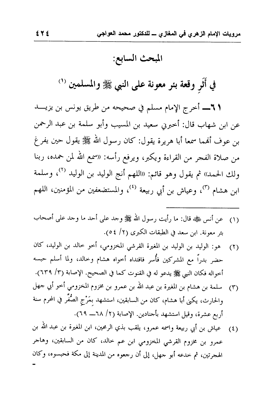 61- أخرج الإمام مسلم في صحيحه من طريق يونس بن يزيد عن ابن شهاب قال: أخبرني سعيد بن المسيب وأبو سلمة بن عبد الرحمن بن عوف أنهما سمعا أبا هريرة يقول: “ كان رسول الله صلى الله عليه وسلم يقول حين يفرغ من صلاة الفجر من القراءة ويكبر، ويرفع رأسه: (سمع الله لمن حمده، ربنا ولك الحمد) ثم يقول وهو قائم: “اللهم أنج الوليد بن الوليد2، وسلمة ابن هشام3، وعياش بن أبي ربيعة4، والمستضعفين من المؤمنين، اللهم
