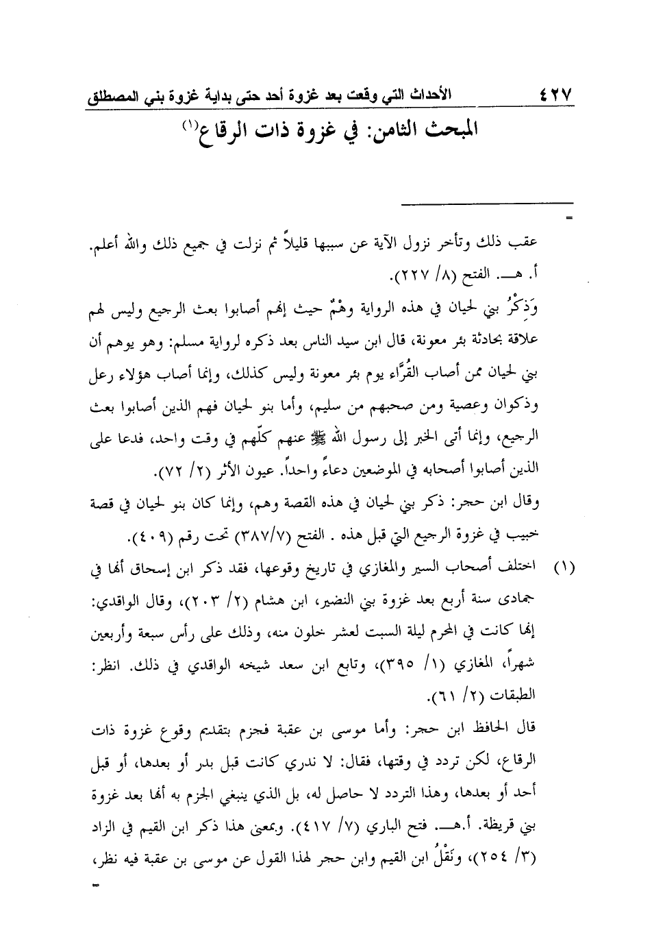 قال الحافظ ابن حجر: "وأما موسى بن عقبة فجزم بتقديم وقوع غزوة ذات الرقاع، لكن تردد في وقتها، فقال: لا ندري كانت قبل بدر أو بعدها، أو قبل أحد أو بعدها، وهذا التردد لا حاصل له، بل الذي ينبغي الجزم به أنها بعد غزوة بني قريظة". اهـ. فتح الباري (7/ 417) . وبمعنى هذا ذكر ابن القيم في الزاد (3/ 254) ، ونَقْلُ ابن القيم وابن حجر لهذا القول عن موسى بن عقبة فيه نظر،