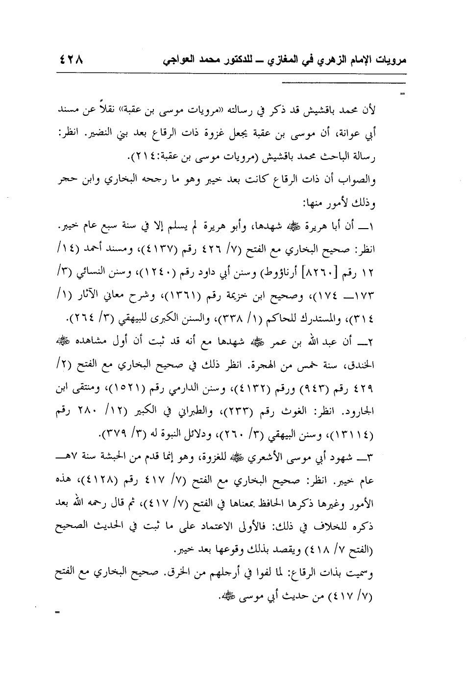 لأن محمد باقشيش قد ذكر في رسالته (مرويات موسى بن عقبة) نقلاً عن مسند أبي عوانة، أن موسى بن عقبة يجعل غزوة ذات الرقاع بعد بني النضير. انظر: رسالة الباحث محمد باقشيش (مرويات موسى بن عقبة:214) .