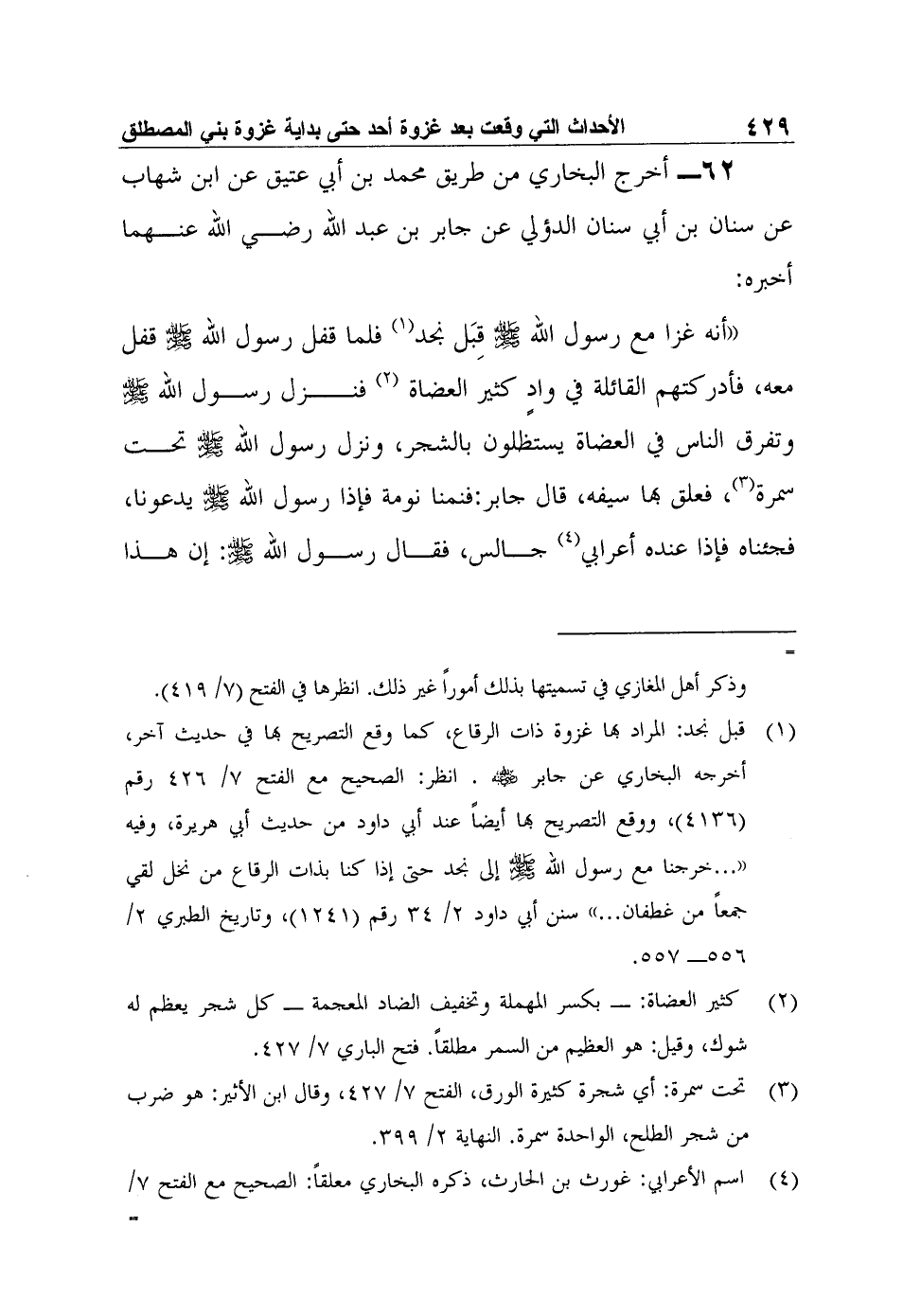 62- أخرج البخاري من طريق محمد بن أبي عتيق عن ابن شهاب عن سنان بن أبي سنان الدؤلي عن جابر بن عبد الله رضي الله عنهما أخبره: "أنه غزا مع رسول الله صلى الله عليه وسلم قِبَل نجد1 فلما قفل رسول الله صلى الله عليه وسلم قفل معه، فأدركتهم القائلة في وادٍ كثير العضاة2 فنزل رسول الله صلى الله عليه وسلم وتفرق الناس في العضاة يستظلون بالشجر، ونزل رسول الله صلى الله عليه وسلم تحت سمرة3، فعلق بها سيفه، قال جابر: فنمنا نومة فإذا رسول الله صلى الله عليه وسلم يدعونا، فجئناه فإذا عنده أعرابي4 جالس، فقال رسول الله صلى الله عليه وسلم: "إن هذا