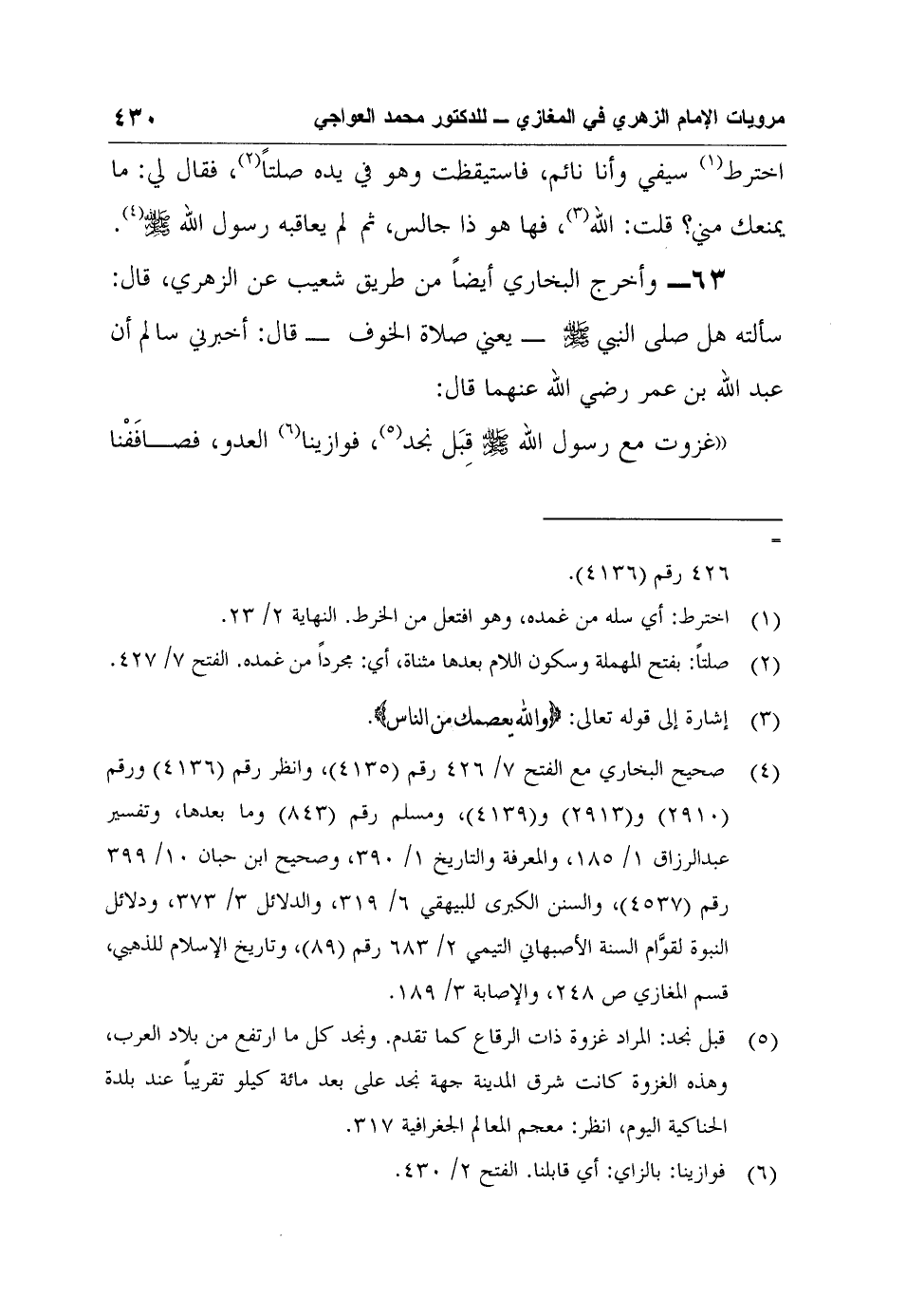 5 قبل نجد: المراد غزوة ذات الرقاع كما تقدم. ونجد كل ما ارتفع من بلاد العرب، وهذه الغزوة كانت شرق المدينة جهة نجد على بعد مائة كيلو تقريباً عند بلدة الحناكية اليوم، انظر: معجم المعالم الجغرافية 317.