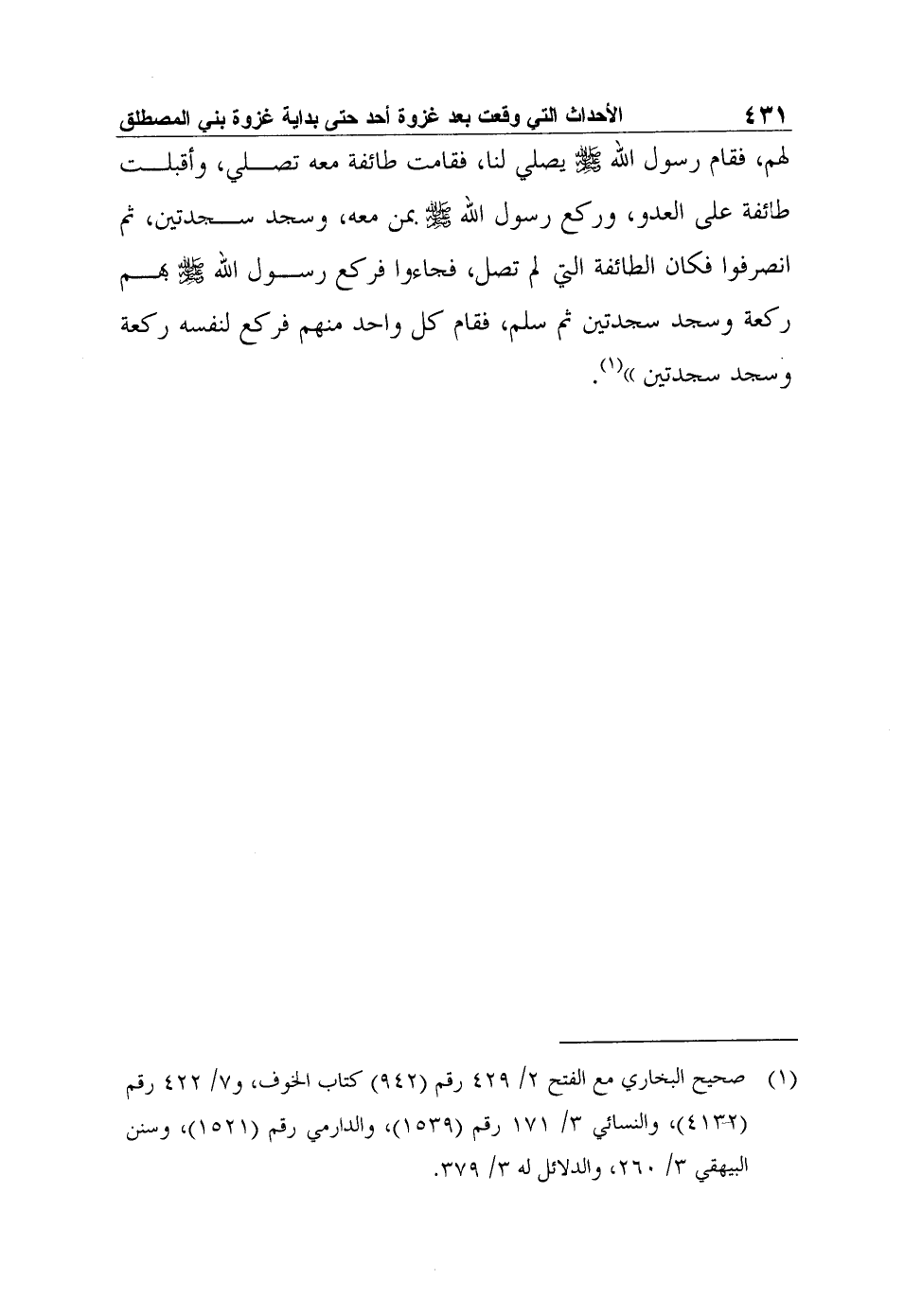 1 صحيح البخاري مع الفتح 2/ 429 رقم (942) كتاب الخوف، و7/ 422 رقم (4132) ، والنسائي 3/ 171 رقم (1539) ، والدارمي رقم (1521) ، وسنن البيهقي 3/ 260، والدلائل له 3/ 379.