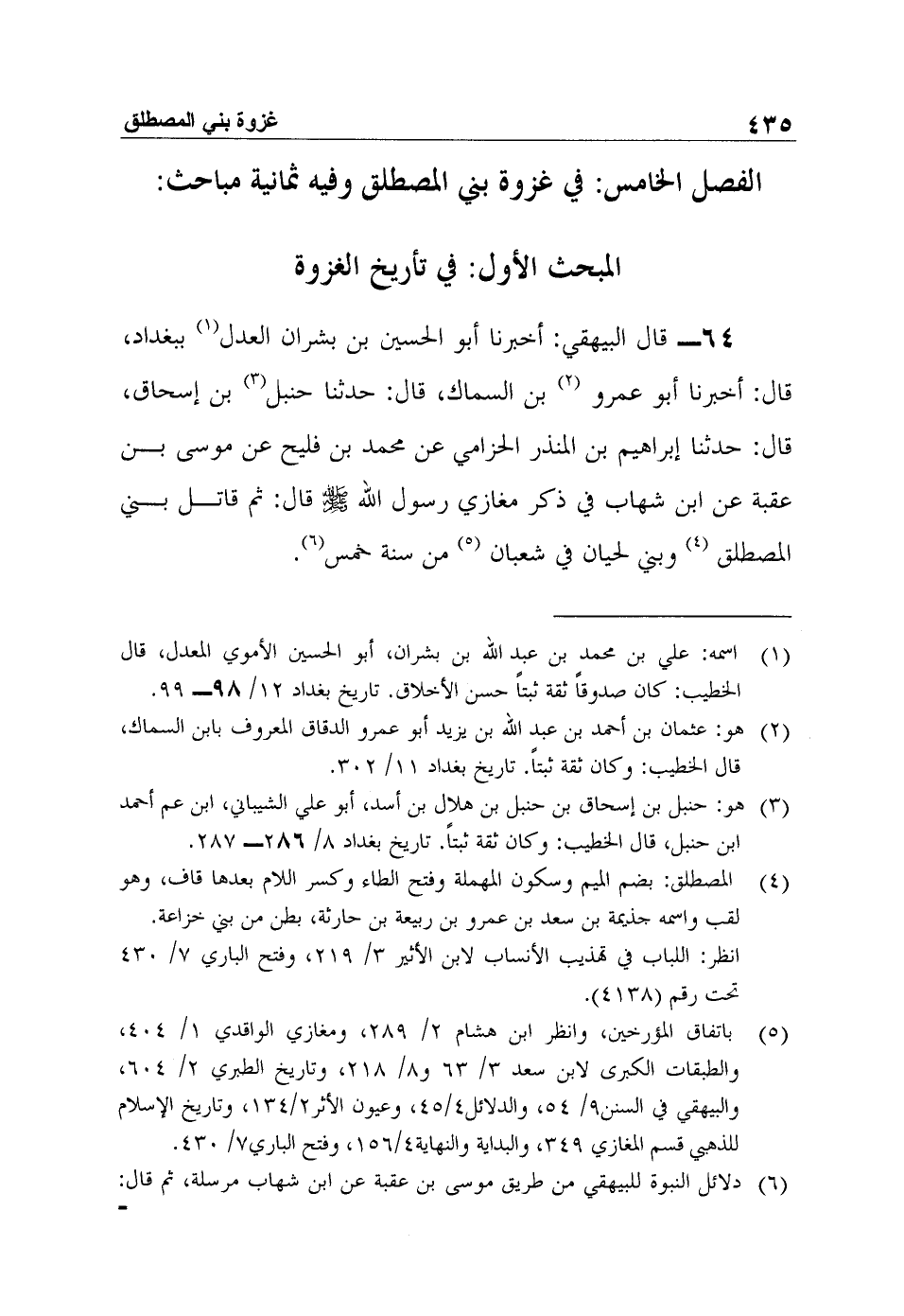 64- قال البيهقي: أخبرنا أبو الحسين بن بشران العدل1 ببغداد، قال: أخبرنا أبو عمرو2 بن السماك، قال: حدثنا حنبل3 بن إسحاق، قال: حدثنا إبراهيم بن المنذر الحزامي عن محمد بن فليح عن موسى بن عقبة عن ابن شهاب في ذكر مغازي رسول الله صلى الله عليه وسلم قال: ثم قاتل بني المصطلق4 وبني لحيان في شعبان5 من سنة خمس6.