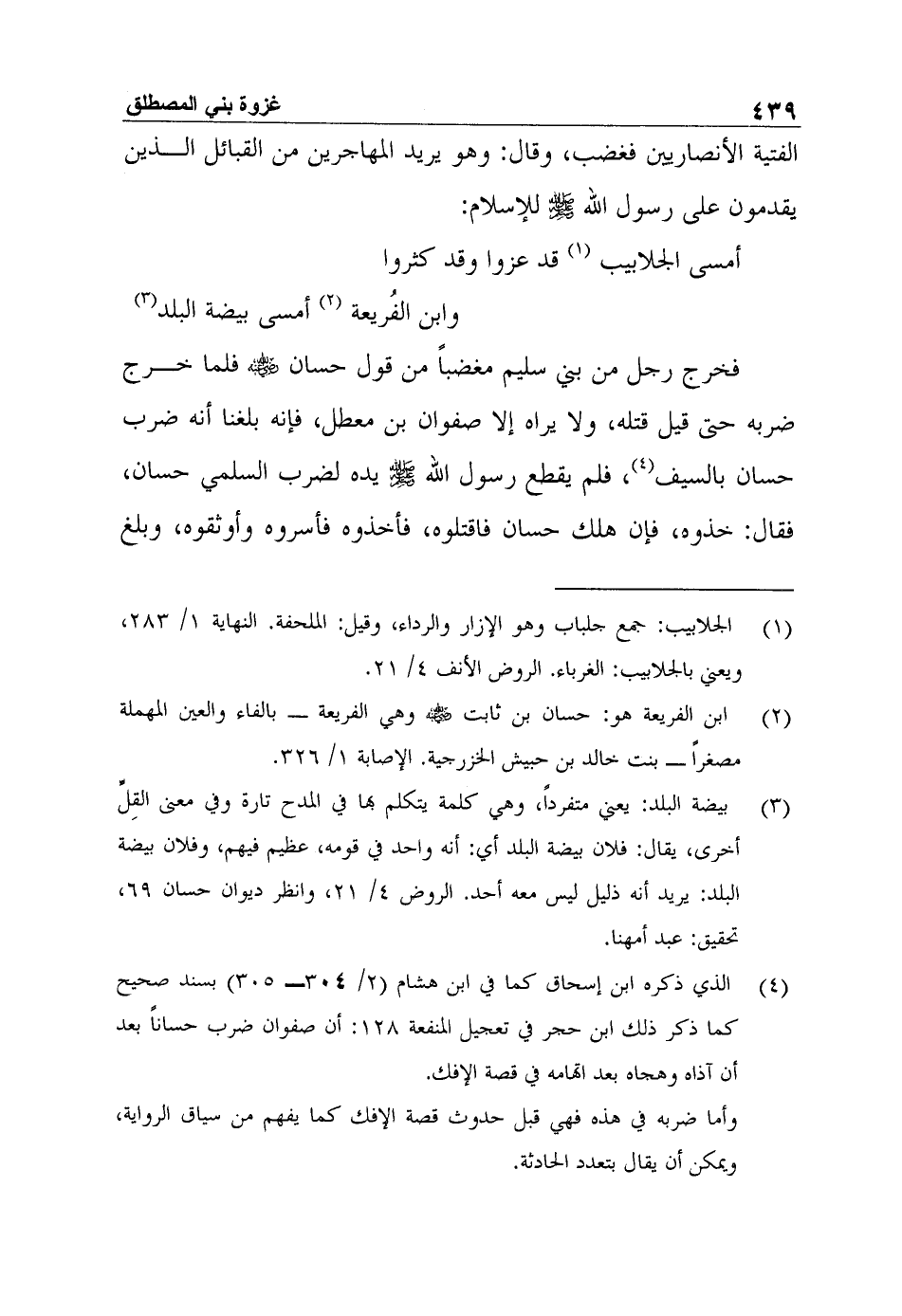 4 الذي ذكره ابن إسحاق كما في ابن هشام (2/ 304- 305) بسند صحيح كما ذكر ذلك ابن حجر في تعجيل المنفعة 128: أن صفوان ضرب حساناً بعد أن آذاه وهجاه بعد اتهامه في قصة الإفك.