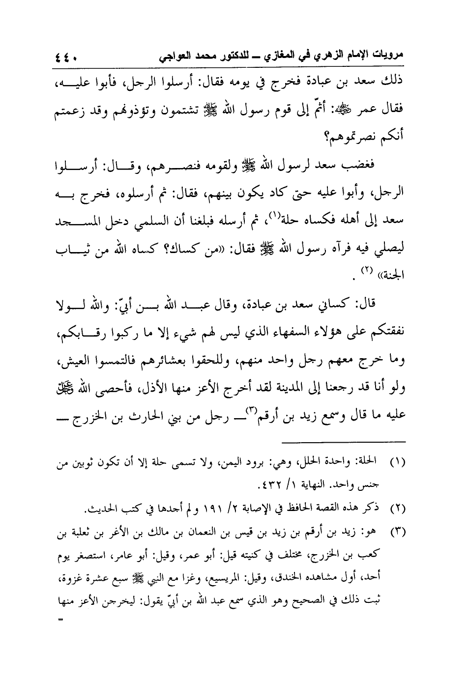 3 هو: زيد بن أرقم بن زيد بن قيس بن النعمان بن مالك بن الأغر بن ثعلبة بن كعب بن الخزرج، مختلف في كنيته قيل: أبو عمر، وقيل: أبو عامر، استصغر يوم أحد، أول مشاهده الخندق، وقيل: المريسيع، وغزا مع النبي صلى الله عليه وسلم سبع عشرة غزوة، ثبت ذلك في الصحيح وهو الذي سمع عبد الله بن أبيّ يقول: ليخرجن الأعز منها الأذل، مات بالكوفة أيام المختار سنة ست وستين وقيل: ثمان وستين. الإصابة 2/ 560.