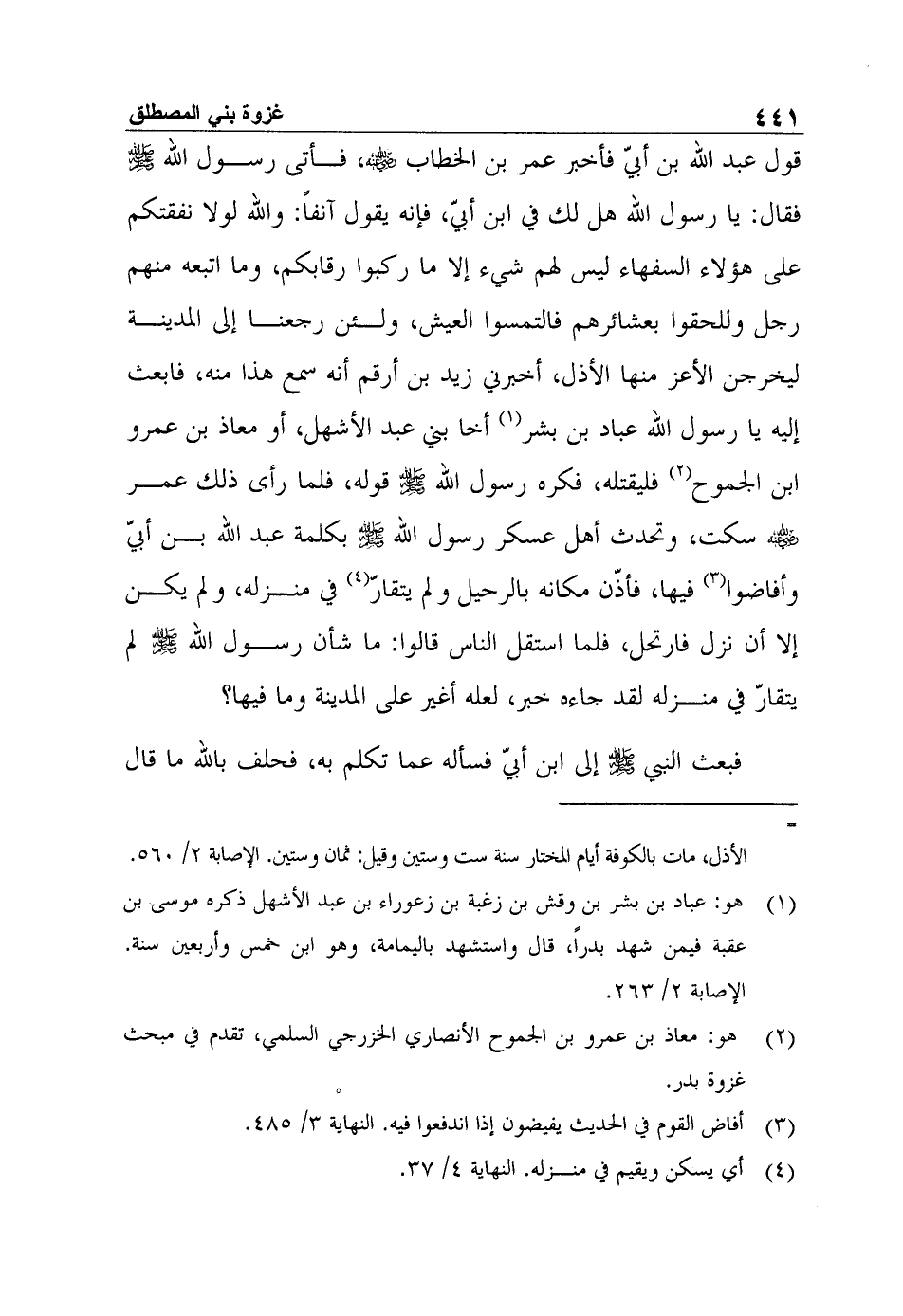 قول عبد الله بن أبيّ فأخبر عمر بن الخطاب رضي الله عنه، فأتى رسول الله صلى الله عليه وسلم فقال: يا رسول الله هل لك في ابن أبيّ، فإنه يقول آنفاً: والله لولا نفقتكم على هؤلاء السفهاء ليس لهم شيء إلا ما ركبوا رقابكم، وما اتبعه منهم رجل وللحقوا بعشائرهم فالتمسوا العيش، ولئن رجعنا إلى المدينة ليخرجن الأعز منها الأذل، أخبرني زيد بن أرقم أنه سمع هذا منه، فابعث إليه يا رسول الله عباد بن بشر1 أخا بني عبد الأشهل، أو معاذ بن عمرو ابن الجموح2 فليقتله، فكره رسول الله صلى الله عليه وسلم قوله، فلما رأى ذلك عمر رضي الله عنه سكت، وتحدث أهل عسكر رسول الله صلى الله عليه وسلم بكلمة عبد الله بن أبيّ وأفاضوا3 فيها، فأذّن مكانه بالرحيل ولم يتقارّ4 في منزله، ولم يكن إلا أن نزل فارتحل، فلما استقل الناس قالوا: ما شأن رسول الله صلى الله عليه وسلم لم يتقارّ في منزله لقد جاءه خبر، لعله أغير على المدينة وما فيها؟