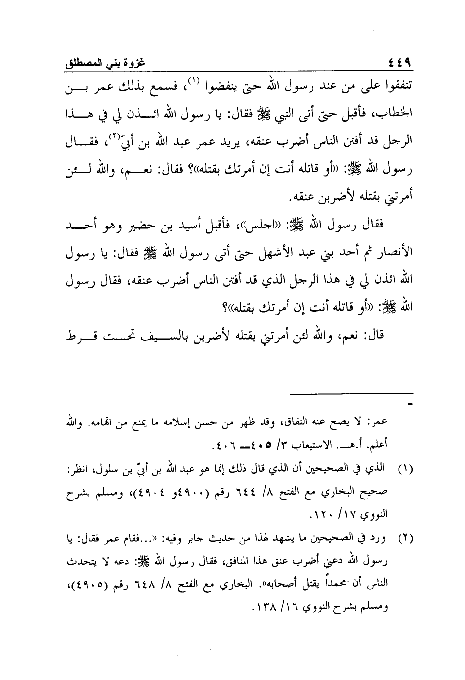 2 ورد في الصحيحين ما يشهد لهذا من حديث جابر وفيه: " ... فقام عمر فقال: يا رسول الله دعني أضرب عنق هذا المنافق، فقال رسول الله صلى الله عليه وسلم: دعه لا يتحدث الناس أن محمداً يقتل أصحابه". البخاري مع الفتح 8/ 648 رقم (4905) ، ومسلم بشرح النووي 16/ 138.