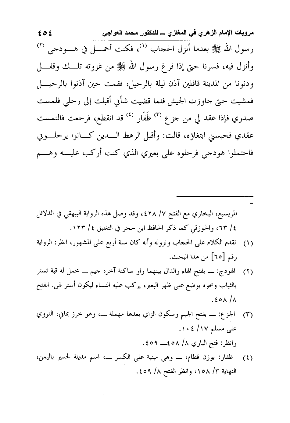 1 تقدم الكلام على الحجاب ونزوله وأنه كان سنة أربع على المشهور، انظر: الرواية رقم [65] من هذا البحث.