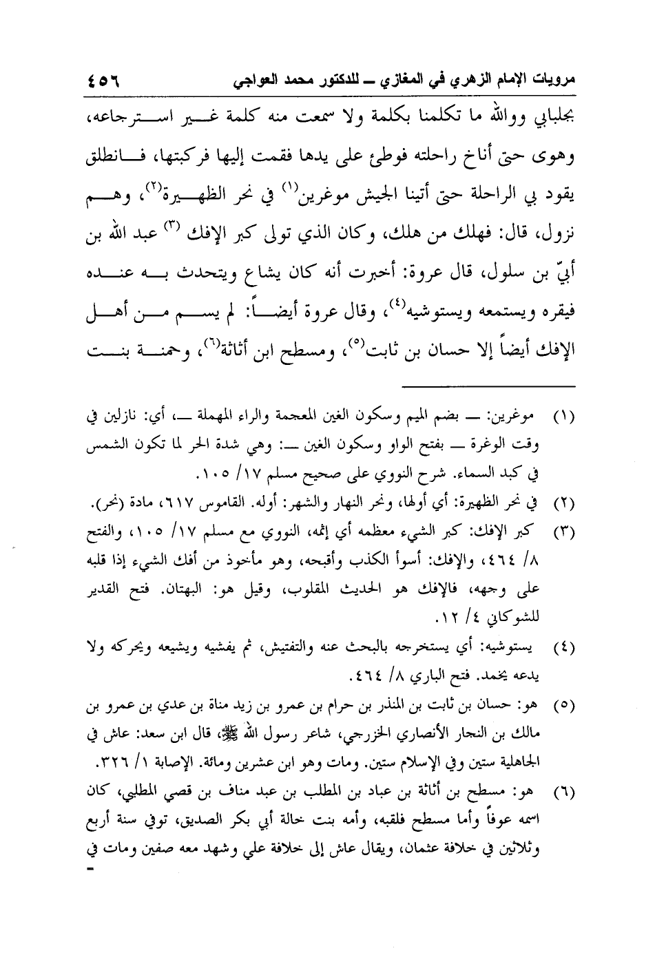3 كبر الإفك: كبر الشيء معظمه أي إثمه، النووي مع مسلم 17/ 105، والفتح 8/ 464، والإفك: أسوأ الكذب وأقبحه، وهو مأخوذ من أفك الشيء إذا قلبه على وجهه، فالإفك هو الحديث المقلوب، وقيل هو: البهتان. فتح القدير للشوكاني 4/ 12.