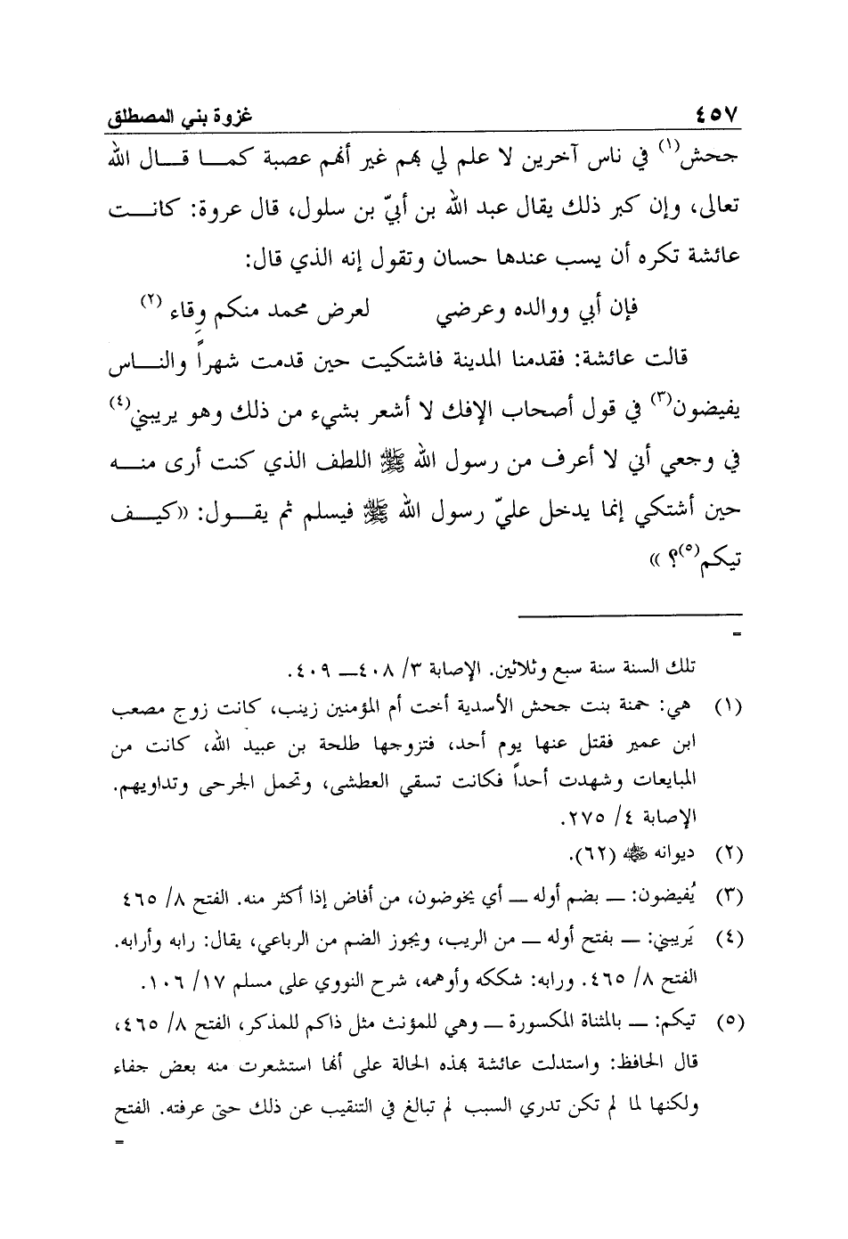 1 هي: حمنة بنت جحش الأسدية أخت أم المؤمنين زينب، كانت زوج مصعب ابن عمير فقتل عنها يوم أحد، فتزوجها طلحة بن عبيد الله، كانت من المبايعات وشهدت أحداً فكانت تسقي العطشى، وتحمل الجرحى وتداويهم. الإصابة 4/ 275.
