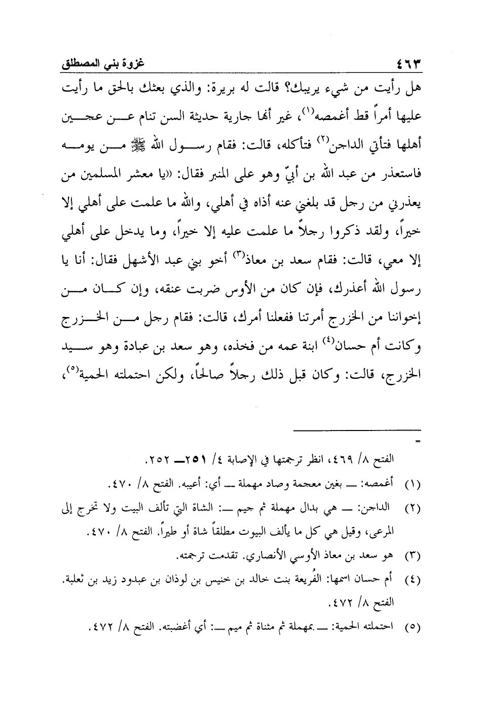 4 أم حسان اسمها: الفُريعة بنت خالد بن خنيس بن لوذان بن عبدود زيد بن ثعلبة. الفتح 8/ 472.