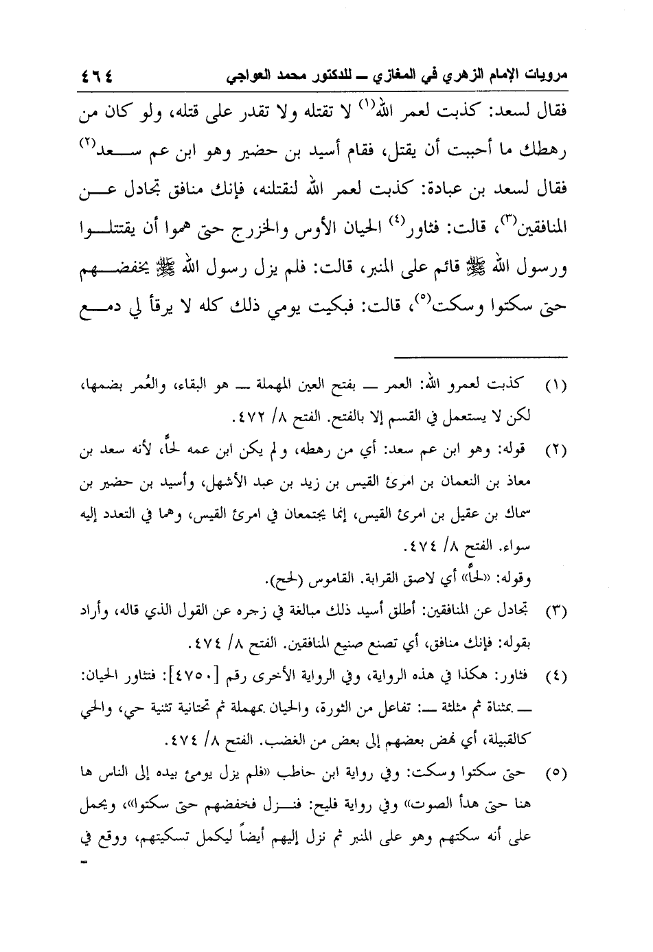فقال لسعد: كذبت لعمر الله1 لا تقتله ولا تقدر على قتله، ولو كان من رهطك ما أحببت أن يقتل، فقام أسيد بن حضير وهو ابن عم سعد2 فقال لسعد بن عبادة: كذبت لعمر الله لنقتلنه، فإنك منافق تجادل عن المنافقين3، قالت: فثاور4 الحيان الأوس والخزرج حتى هموا أن يقتتلوا ورسول الله صلى الله عليه وسلم قائم على المنبر، قالت: فلم يزل رسول الله صلى الله عليه وسلم يخفضهم حتى سكتوا وسكت5، قالت: فبكيت يومي ذلك كله لا يرقأ لي دمع