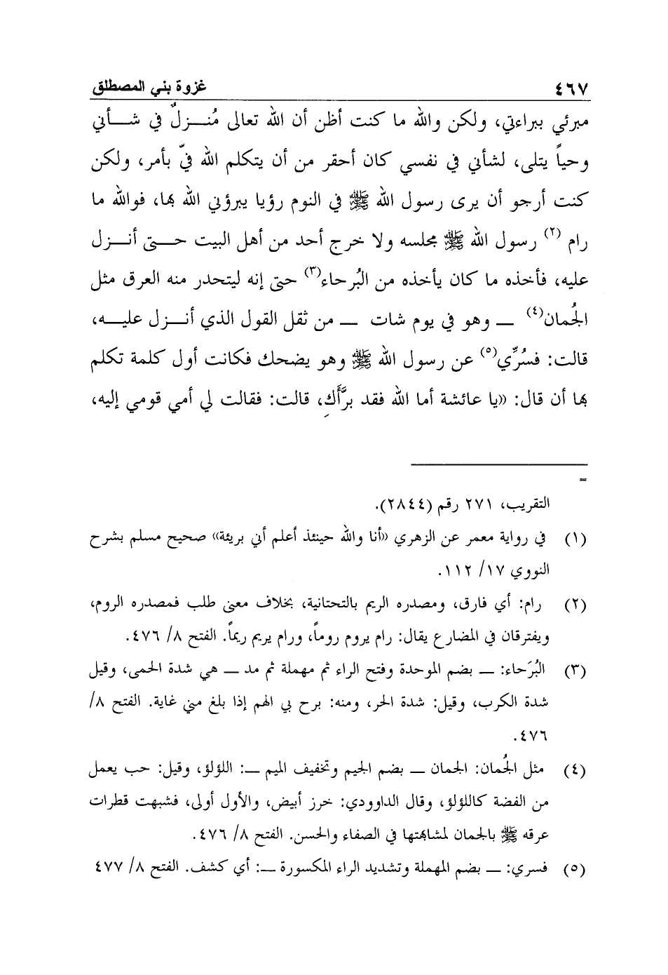 مبرئي ببراءتي، ولكن والله ما كنت أظن أن الله تعالى مُنزلٌ في شأني وحياً يتلى، لشأني في نفسي كان أحقر من أن يتكلم الله فيّ بأمر، ولكن كنت أرجو أن يرى رسول الله صلى الله عليه وسلم في النوم رؤيا يبرؤني الله بها، فوالله ما رام1 رسول الله صلى الله عليه وسلم مجلسه ولا خرج أحد من أهل البيت حتى أنزل عليه، فأخذه ما كان يأخذه من البُرحاء2 حتى إنه ليتحدر منه العرق مثل الجُمان3 - وهو في يوم شات - من ثقل القول الذي أنزل عليه، قالت: فسُرِّي4 عن رسول الله صلى الله عليه وسلم وهو يضحك فكانت أول كلمة تكلم بها أن قال: "يا عائشة أما الله فقد برَّأَكِ"، قالت: فقالت لي أمي قومي إليه،
