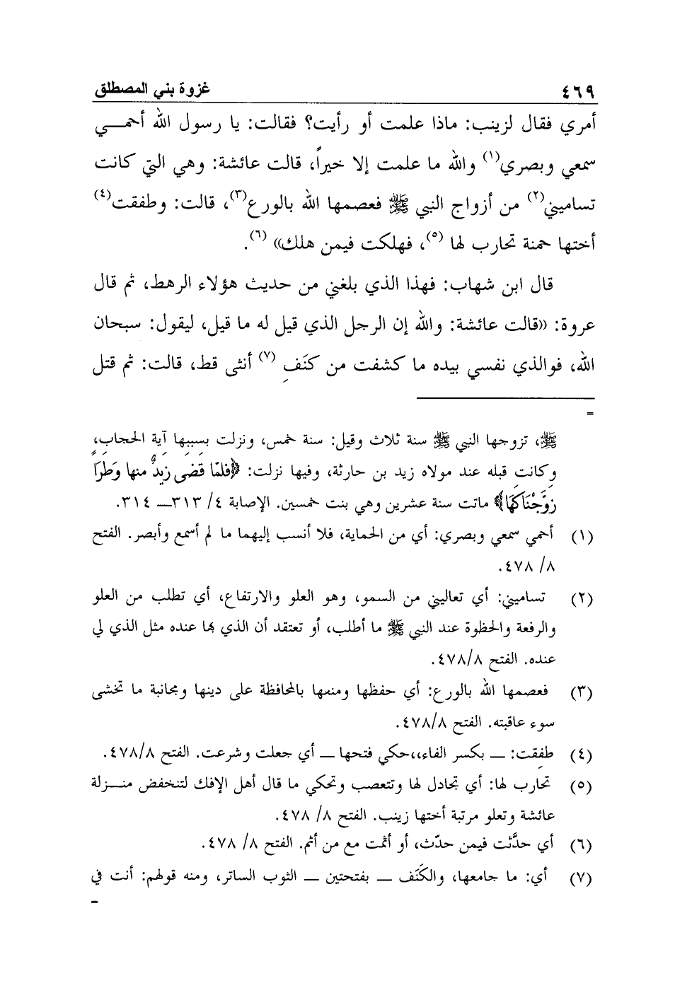 أمري فقال لزينب: ماذا علمت أو رأيت؟ فقالت: يا رسول الله أحمي سمعي وبصري1 والله ما علمت إلا خيراً، قالت عائشة: وهي التي كانت تساميني2 من أزواج النبي صلى الله عليه وسلم فعصمها الله بالورع3، قالت: وطفقت4 أختها حمنة تحارب لها5، فهلكت فيمن هلك"6.