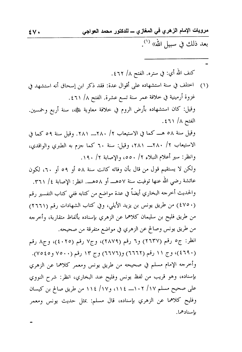 1 اختلف في سنة استشهاده على أقوال عدة: فقد ذكر ابن إسحاق أنه استشهد في غزوة أرمينية في خلافة عمر سنة تسع عشرة. الفتح 8/ 461.