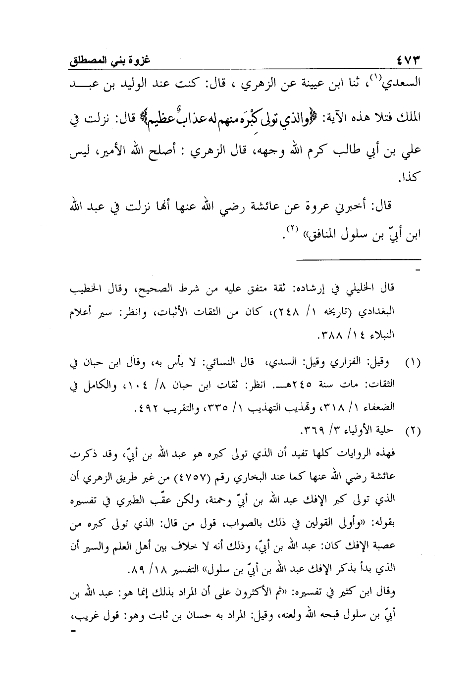 السعدي1، ثنا ابن عيينة عن الزهري، قال: كنت عند الوليد بن عبد الملك فتلا هذه الآية: {وَالَّذِي تَوَلَّى كِبْرَهُ مِنْهُمْ لَهُ عَذَابٌ عَظِيمٌ} قال: نزلت في علي بن أبي طالب كرم الله وجهه، قال الزهري: أصلح الله الأمير، ليس كذا.