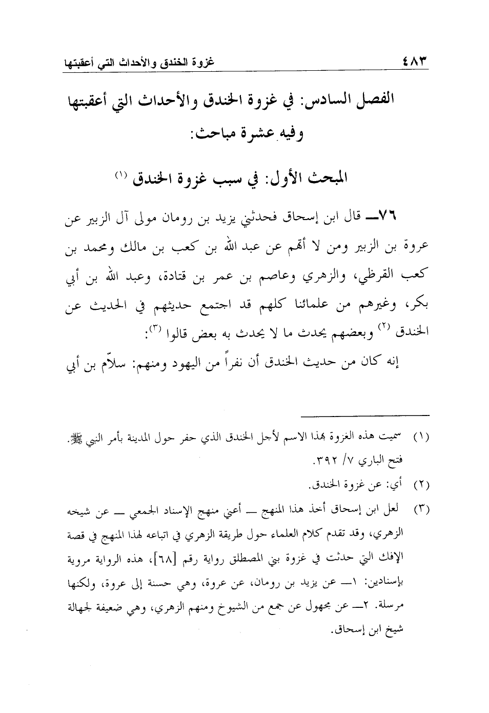 76- قال ابن إسحاق فحدثني يزيد بن رومان مولى آل الزبير عن عروة بن الزبير ومن لا أتهم عن عبد الله بن كعب بن مالك ومحمد بن كعب القرظي، والزهري وعاصم بن عمر بن قتادة، وعبد الله بن أبي بكر، وغيرهم من علمائنا كلهم قد اجتمع حديثهم في الحديث عن الخندق2 وبعضهم يحدث ما لا يحدث به بعض قالوا3: إنه كان من حديث الخندق أن نفراً من اليهود ومنهم: سلاّم بن أبي