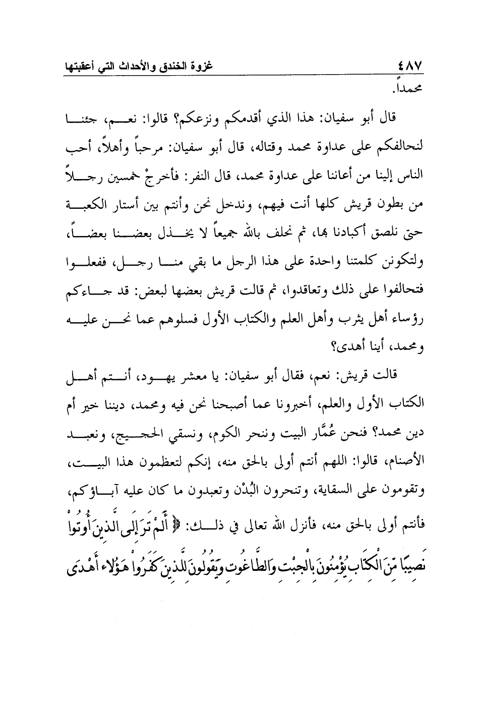 قالت قريش: نعم، فقال أبو سفيان: يا معشر يهود، أنتم أهل الكتاب الأول والعلم، أخبرونا عما أصبحنا نحن فيه ومحمد، ديننا خير أم دين محمد؟ فنحن عُمَّار البيت وننحر الكوم، ونسقي الحجيج، ونعبد الأصنام، قالوا: اللهم أنتم أولى بالحق منه، إنكم لتعظمون هذا البيت، وتقومون على السقاية، وتنحرون البُدْن وتعبدون ما كان عليه آباؤكم، فأنتم أولى بالحق منه، فأنزل الله تعالى في ذلك: {أَلَمْ تَرَ إِلَى الَّذِينَ أُوتُواْ نَصِيبًا مِّنَ الْكِتَابِ يُؤْمِنُونَ بِالْجِبْتِ وَالطَّاغُوتِ وَيَقُولُونَ لِلَّذِينَ كَفَرُواْ هَؤُلاء أَهْدَى