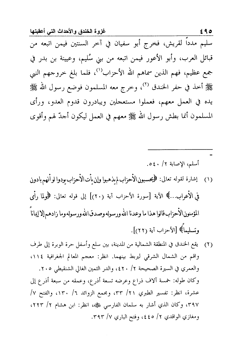 وكان طوله: خمسة آلاف ذراع وعرضه تسعة أذرع، وعمقه من سبعة أذرع إلى عشرة، انظر: تفسير الطبري 21/ 33، ومجمع الزوائد 6/ 130، والفتح 7/ 397، وكان الذي أشار به سلمان الفارسي رصي الله عنه، انظر: ابن هشام 2/ 223، ومغازي الواقدي 2/ 445، وفتح الباري 7/ 393.