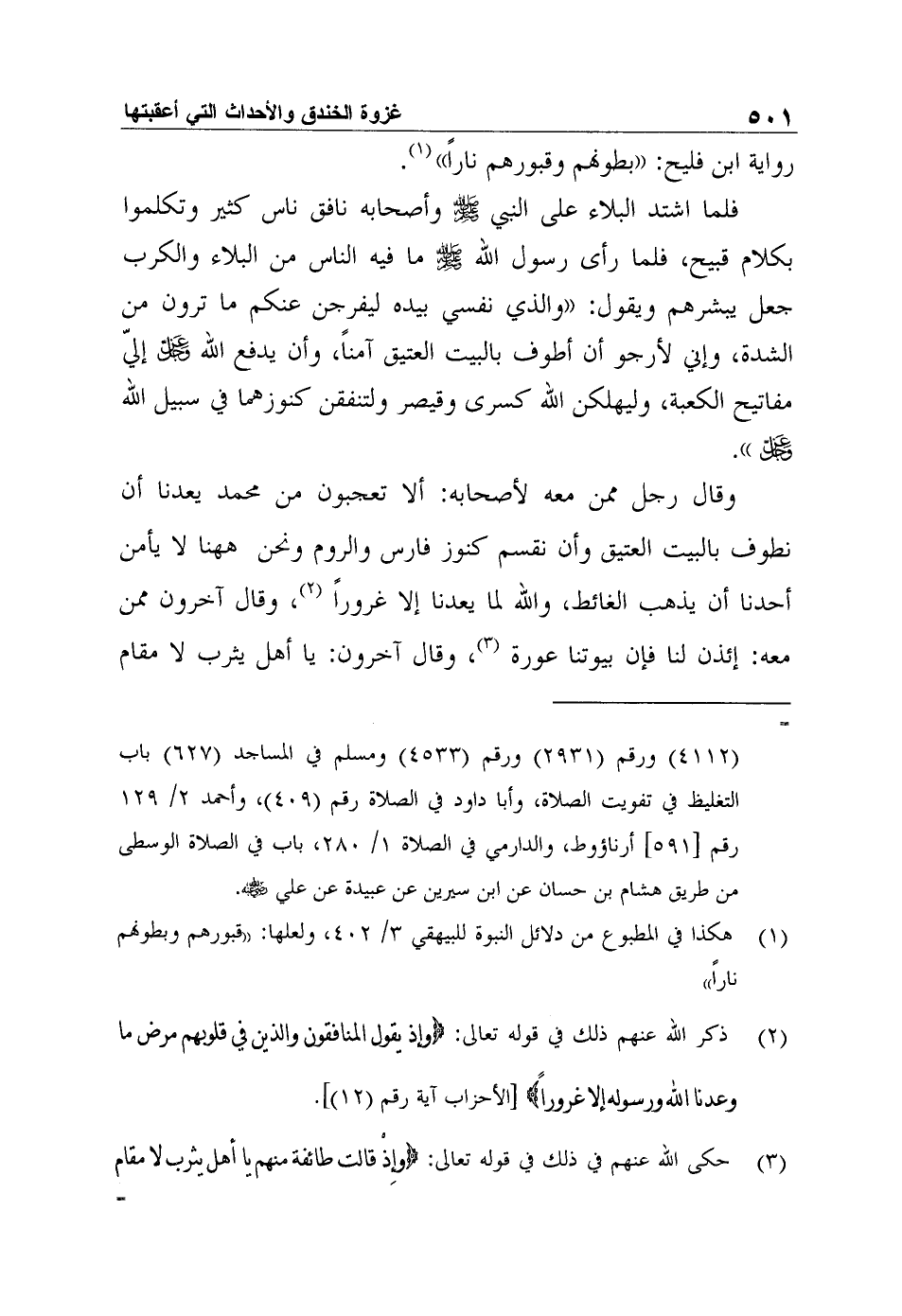 وقال رجل ممن معه لأصحابه: ألا تعجبون من محمد يعدنا أن نطوف بالبيت العتيق وأن نقسم كنوز فارس والروم ونحن ههنا لا يأمن أحدنا أن يذهب الغائط، والله لما يعدنا إلا غروراً2، وقال آخرون ممن معه: إئذن لنا فإن بيوتنا عورة3، وقال آخرون: يا أهل يثرب لا مقام