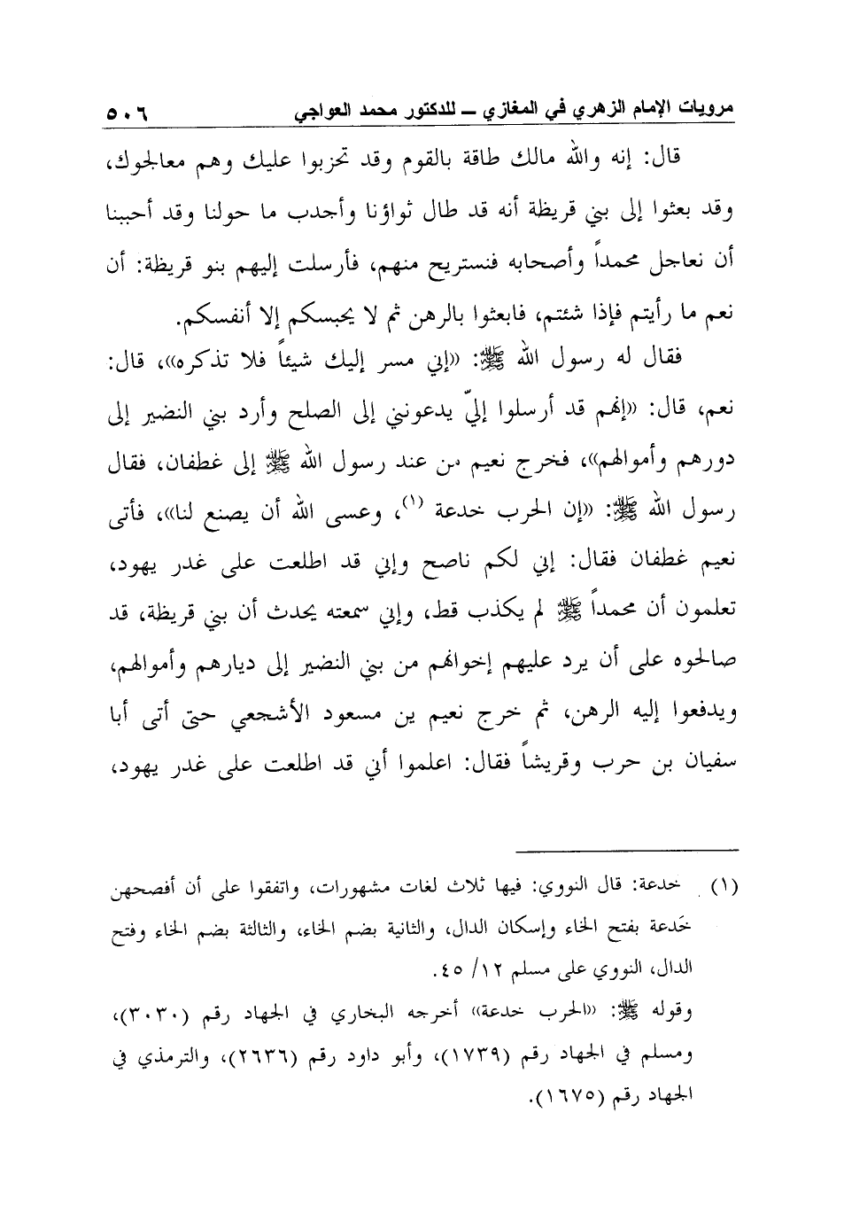 1 خدعة: قال النووي: فيها ثلاث لغات مشهورات، واتفقوا على أن أفصحهن خَدعة بفتح الخاء وإسكان الدال، والثانية بضم الخاء، والثالثة بضم الخاء وفتح الدال، النووي على مسلم 12/ 45.