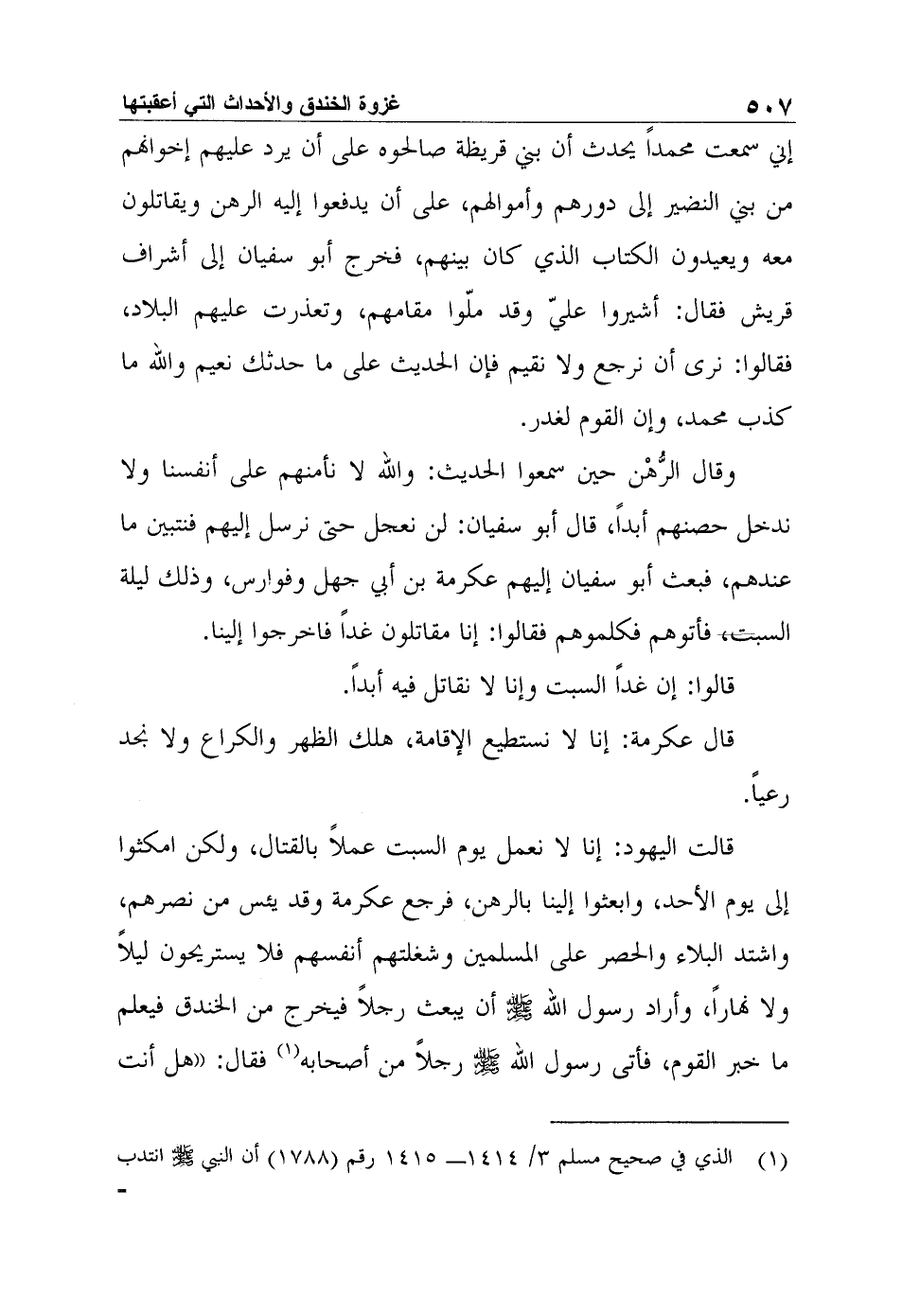 إني سمعت محمداً يحدث أن بني قريظة صالحوه على أن يرد عليهم إخوانهم من بني النضير إلى دورهم وأموالهم، على أن يدفعوا إليه الرهن ويقاتلون معه ويعيدون الكتاب الذي كان بينهم، فخرج أبو سفيان إلى أشراف قريش فقال: أشيروا عليّ وقد ملّوا مقامهم، وتعذرت عليهم البلاد، فقالوا: نرى أن نرجع ولا نقيم فإن الحديث على ما حدثك نعيم والله ما كذب محمد، وإن القوم لغدر.