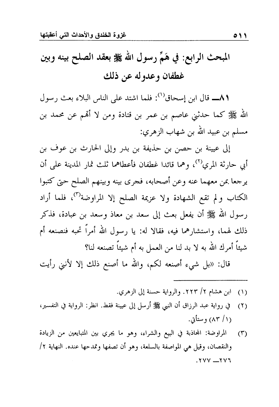 المبحث الرابع: في هَمِّ رسول الله صلى الله عليه وسلم بعقد الصلح بينه وبين غطفان وعدوله عن ذلك