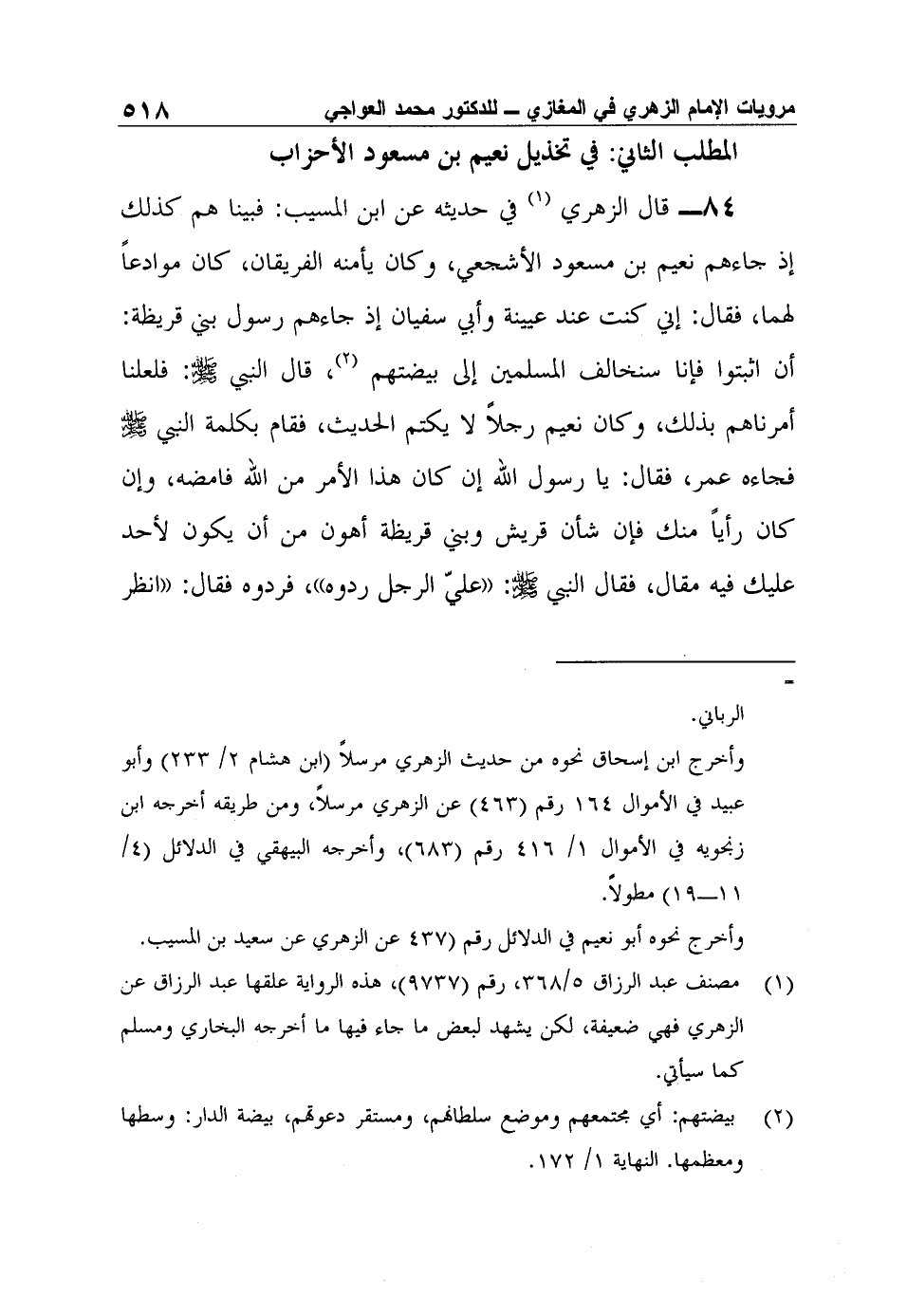 84- قال الزهري1 في حديثه عن ابن المسيب: فبينا هم كذلك إذ جاءهم نعيم بن مسعود الأشجعي، وكان يأمنه الفريقان، كان موادعاً لهما، فقال: إني كنت عند عيينة وأبي سفيان إذ جاءهم رسول بني قريظة: أن اثبتوا فإنا سنخالف المسلمين إلى بيضتهم2، قال النبي صلى الله عليه وسلم: فلعلنا أمرناهم بذلك، وكان نعيم رجلاً لا يكتم الحديث، فقام بكلمة النبي صلى الله عليه وسلم فجاءه عمر، فقال: يا رسول الله إن كان هذا الأمر من الله فامضه، وإن كان رأياً منك فإن شأن قريش وبني قريظة أهون من أن يكون لأحد عليك فيه مقال، فقال النبي صلى الله عليه وسلم: "عليّ الرجل ردوه"، فردوه فقال: "انظر