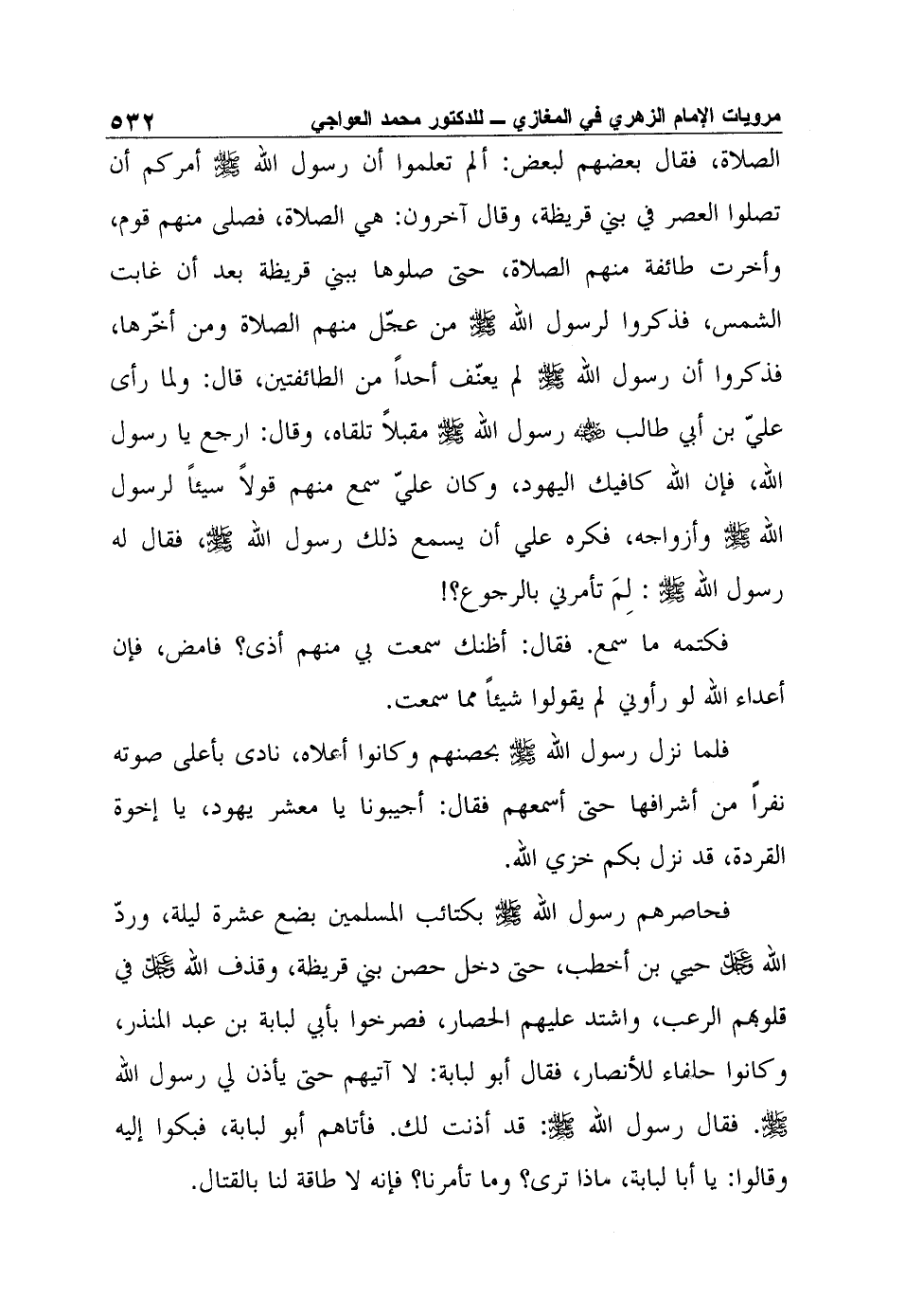 الصلاة، فقال بعضهم لبعض: ألم تعلموا أن رسول الله صلى الله عليه وسلم أمركم أن تصلوا العصر في بني قريظة، وقال آخرون: هي الصلاة، فصلى منهم قوم، وأخرت طائفة منهم الصلاة، حتى صلوها ببني قريظة بعد أن غابت الشمس، فذكروا لرسول الله صلى الله عليه وسلم من عجّل منهم الصلاة ومن أخّرها، فذكروا أن رسول الله صلى الله عليه وسلم لم يعنّف أحداً من الطائفتين، قال: ولما رأى عليّ بن أبي طالب رصي الله عنه رسول الله صلى الله عليه وسلم مقبلاً تلقاه، وقال: ارجع يا رسول الله، فإن الله كافيك اليهود، وكان عليّ سمع منهم قولاً سيئاً لرسول الله صلى الله عليه وسلم وأزواجه، فكره علي أن يسمع ذلك رسول الله صلى الله عليه وسلم، فقال له رسول الله صلى الله عليه وسلم: لِمَ تأمرني بالرجوع؟!