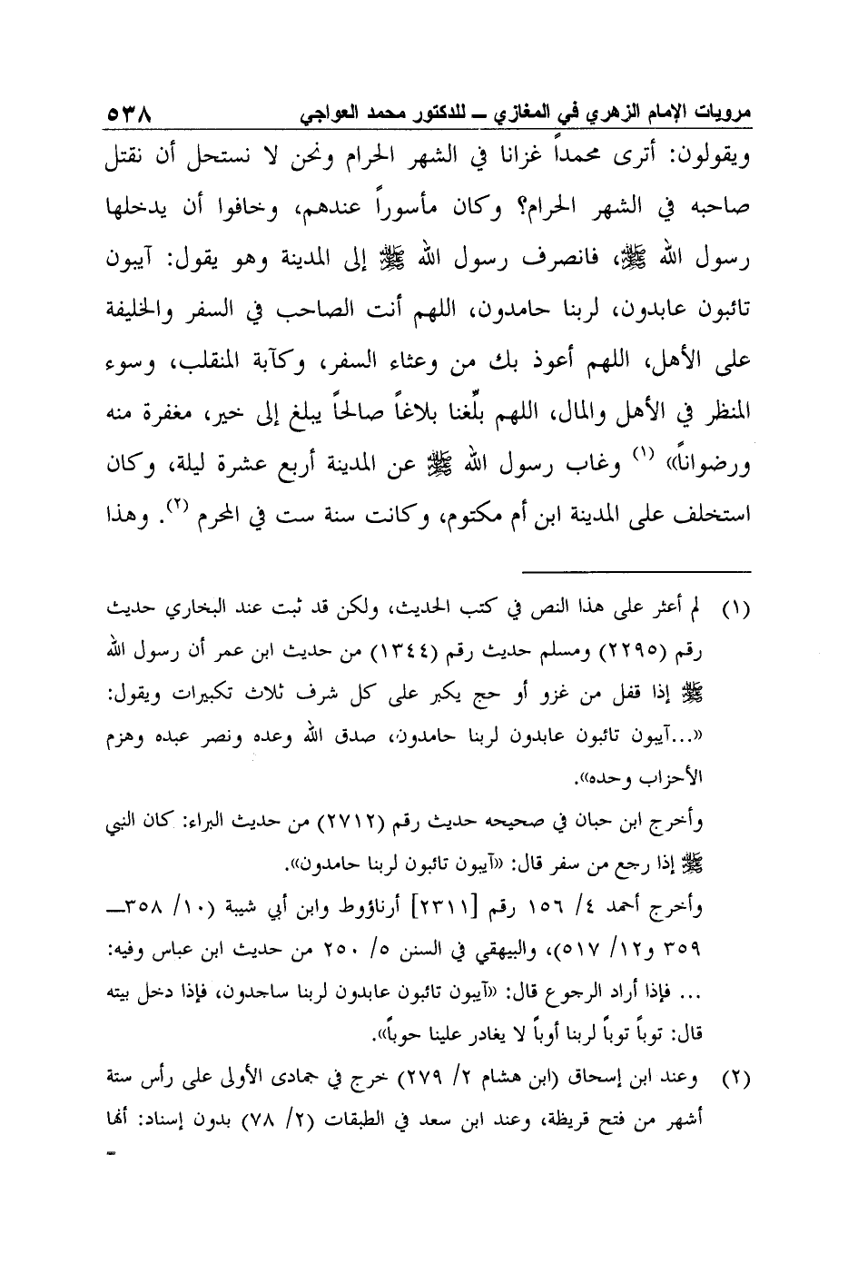 ويقولون: أترى محمداً غزانا في الشهر الحرام ونحن لا نستحل أن نقتل صاحبه في الشهر الحرام؟ وكان مأسوراً عندهم، وخافوا أن يدخلها رسول الله صلى الله عليه وسلم، فانصرف رسول الله صلى الله عليه وسلم إلى المدينة وهو يقول:" آيبون تائبون عابدون، لربنا حامدون، اللهم أنت الصاحب في السفر والخليفة على الأهل، اللهم أعوذ بك من وعثاء السفر، وكآبة المنقلب، وسوء المنظر في الأهل والمال، اللهم بلِّغنا بلاغاً صالحاً يبلغ إلى خير، مغفرة منه ورضواناً"1 وغاب رسول الله صلى الله عليه وسلم عن المدينة أربع عشرة ليلة، وكان استخلف على المدينة ابن أم مكتوم، وكانت سنة ست في المحرم2. وهذا