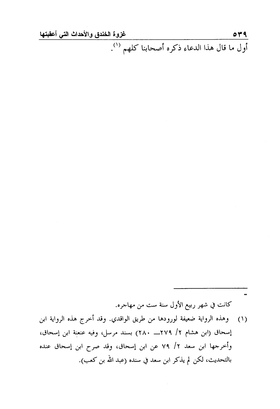 1 وهذه الرواية ضعيفة لورودها من طريق الواقدي. وقد أخرج هذه الرواية ابن إسحاق (ابن هشام 2/ 279- 280) بسند مرسل، وفيه عنعنة ابن إسحاق، وأخرجها ابن سعد 2/ 79 عن ابن إسحاق، وقد صرح ابن إسحاق عنده بالتحديث، لكن لم يذكر ابن سعد في سنده (عبد الله بن كعب) .