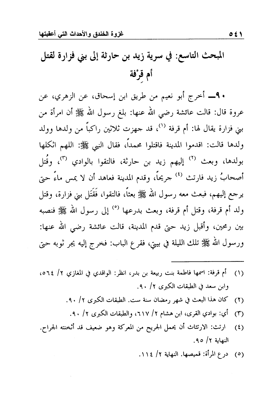 90- أخرج أبو نعيم من طريق ابن إسحاق، عن الزهري، عن عروة قال: قالت عائشة رضي الله عنها: بلغ رسول الله صلى الله عليه وسلم أن امرأة من بني فزارة يقال لها: أم قرفة1، قد جهزت ثلاثين راكباً من ولدها وولد ولدها قالت: اقدموا المدينة فاقتلوا محمداً، فقال النبي صلى الله عليه وسلم: اللهم اثكلها بولدها، وبعث2 إليهم زيد بن حارثة، فالتقوا بالوادي3، وقُتل أصحابُ زيد فارتث4 جريحاً، وقدم المدينة فعاهد أن لا يمس ماءً حتى يرجع إليهم، فبعث معه رسول الله صلى الله عليه وسلم بعثاً، فالتقوا، فَقَتَل بني فزارة، وقتل ولد أم قرفة، وقتل أم قرفة، وبعث بدرعها5 إلى رسول الله صلى الله عليه وسلم فنصبه بين رمحين، وأقبل زيد حتى قدم المدينة، قالت عائشة رضي الله عنها: ورسول الله صلى الله عليه وسلم تلك الليلة في بيتي، فقرع الباب: فخرج إليه يجر ثوبه حتى