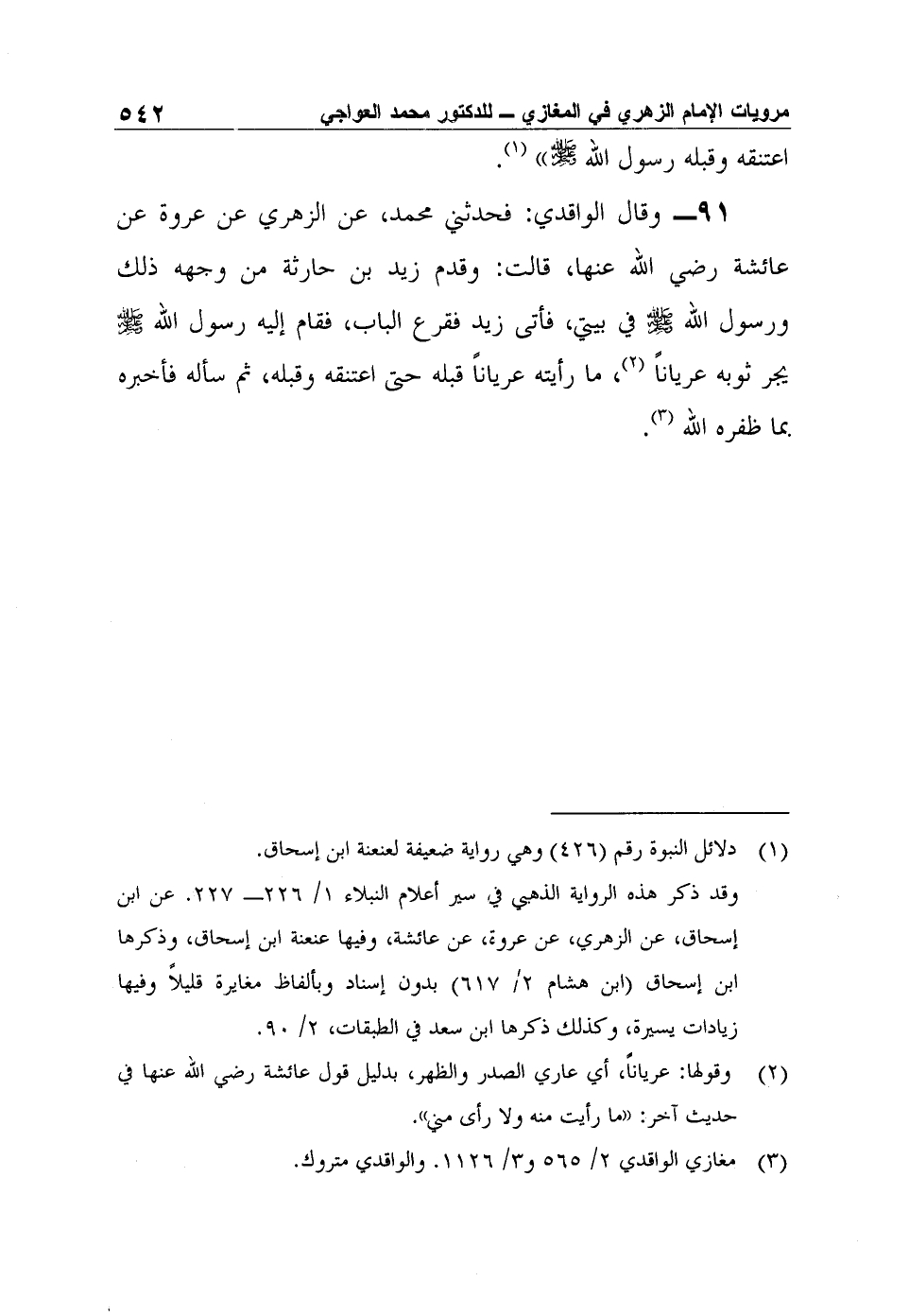 91- وقال الواقدي: فحدثني محمد، عن الزهري عن عروة عن عائشة رضي الله عنها، قالت: وقدم زيد بن حارثة من وجهه ذلك ورسول الله صلى الله عليه وسلم في بيتي، فأتى زيد فقرع الباب، فقام إليه رسول الله صلى الله عليه وسلم يجر ثوبه عرياناً2، ما رأيته عرياناً قبله حتى اعتنقه وقبله، ثم سأله فأخبره بما ظفره الله3.